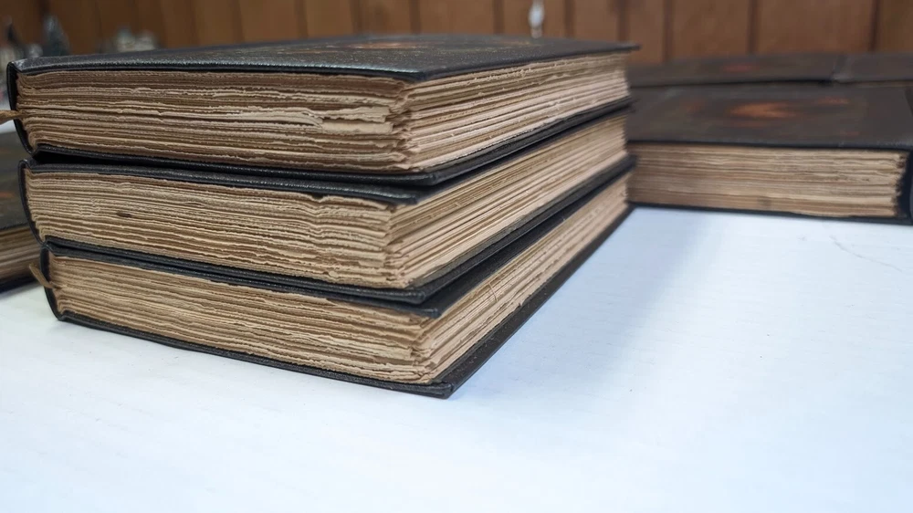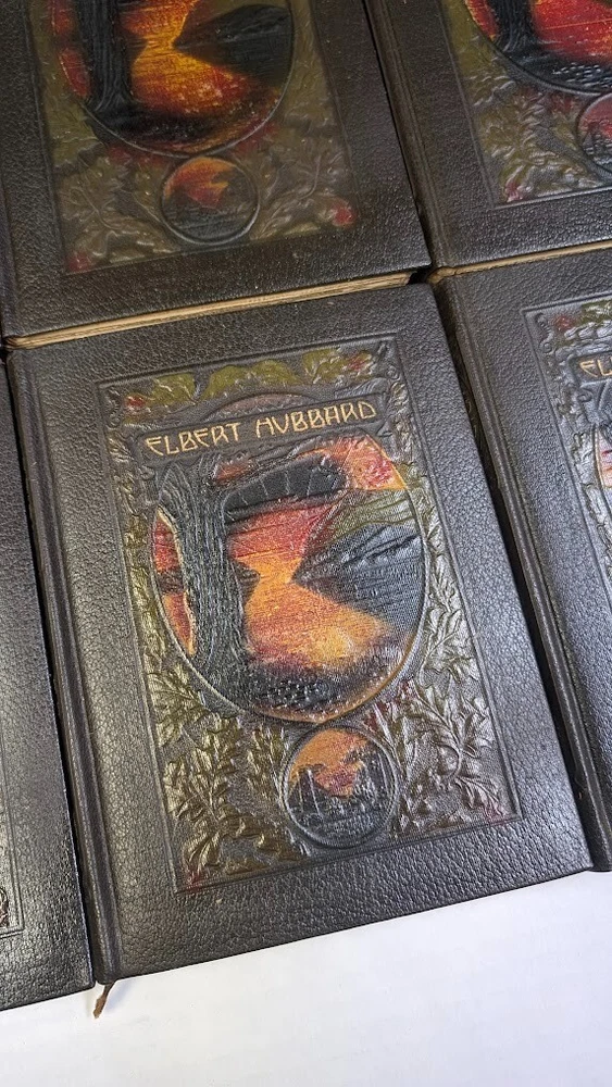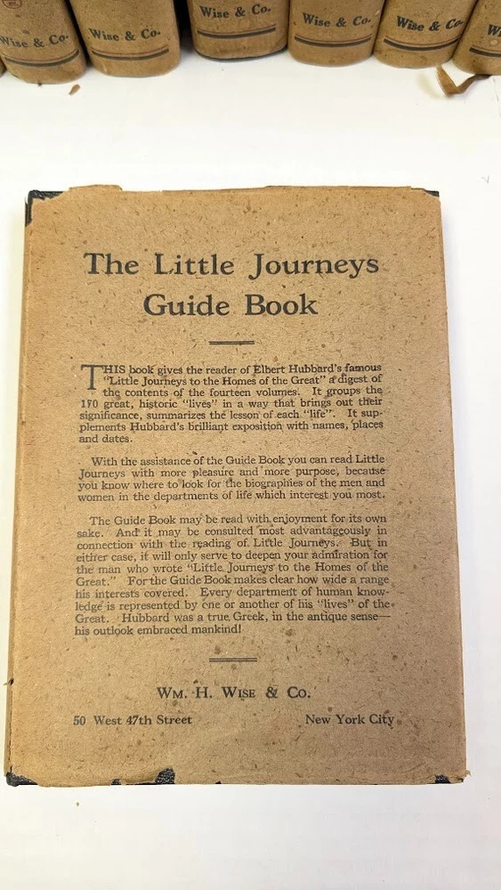 Complete set of 14 little journeys PLUS the guidebook and two notebooks. All leather-bound books come in their original dust jackets and feature gilded, deckle-edged paper. Memorial edition prepared for "Ruth M Wicklein" as seen on the first page of the first volume. Printed in 1916. The accompanying guidebook was printed in 1926. Kept in a climate-controlled room, smoke free home.