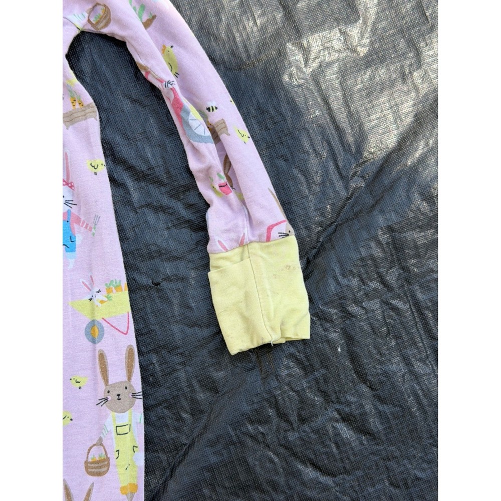 Little Sleepies Zippy pajamas in the adorable Bunny Garden print feature a soft pink base with whimsical rabbits, tractors, and garden motifs. Crafted from signature Lunaluxe bamboo viscose, this one-piece romper offers a snug fit with a convenient two-way double zipper for easy changes. The design includes fold-over cuffs on both the sleeves and feet, allowing for a versatile transition from footless to footed sleepers. Contrast yellow trim adds a bright pop to the neckline and cuffs, ensuring your little one stays comfortable and stylish through the night. Please reference all photos for condition/flaws.
