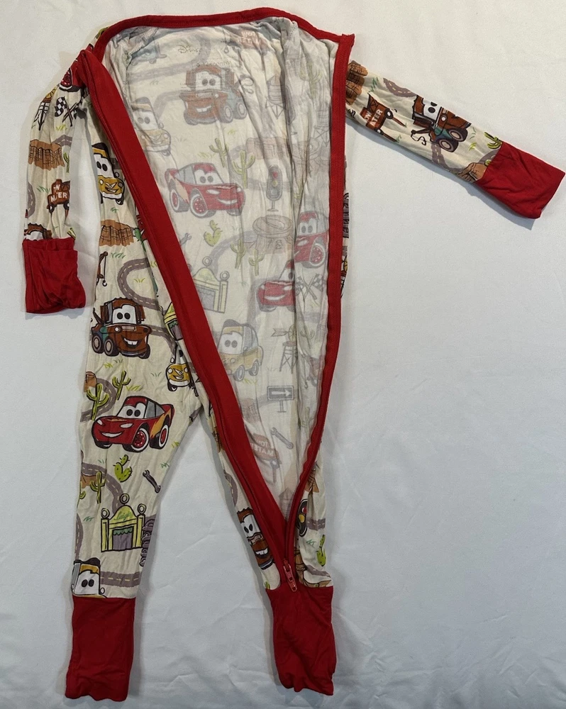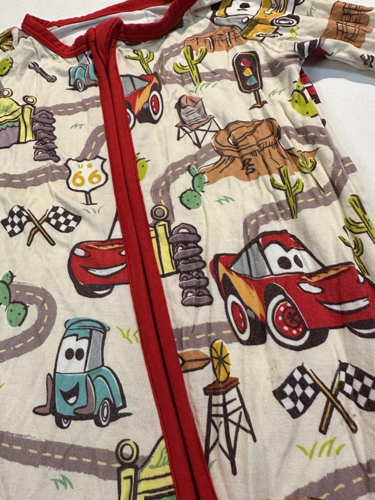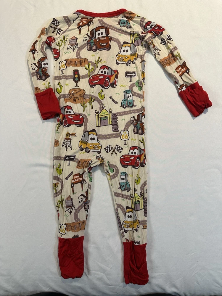 Rev up for bedtime with this limited edition Little Sleepies "Radiator Springs" Zippy! This ultra-soft one-piece features a vibrant, all-over print of your favorite Cars characters like Lightning McQueen and Tow Mater zooming through Route 66. Buttery Soft: Made from signature Lunaluxe™ bamboo fabric that is breathable, moisture-wicking, and perfect for sensitive skin. Designed for Growth: Fits longer than average pajamas due to the stretchy fabric and fold-over foot cuffs that transition from footie to romper. Easy Changes: The convenient two-way zipper makes diaper changes a breeze. The pjs have been worn but still remain in a good quality condition. No visible stains. See all pictures for details and measurements.