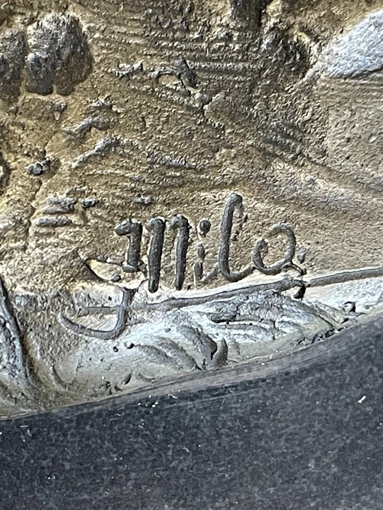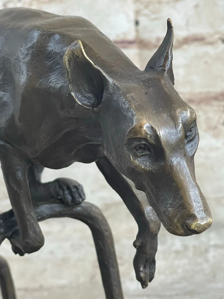 Living Bronze Doberman Pinscher Dog cast bronze statue on marble base 1994 Art Living Bronze Doberman Pinscher Dog cast bronze statue on marble base 1994 Art Condition : This sculpture is in perfect condition. Bronze Dimensions with Marble Base: Height 9" X Length 12" Marble Dimensions: 12"X 6" Height without base: 8.5" Weight: 12 LBS Inventory: 9440K13049 This high-energy dog leaps over hurdles with remarkable skill and vivacity, showcasing its talent and adventurous spirit. Crafted in bronze patina, this sculpture captures the essence of a jumping dog with exquisite details that bring out the dog's elegance and charm. The piece, signed by the artist Milo, depicts the dog gazing intently ahead, capturing a moment of pure athleticism and grace. The statuesque pose of this magnificent creature exudes aristocratic charm and grace. The intricate details of the sculpture, from the texture of the dog's fur to the muscular definition of its body, showcase the artist's dedication to capturing the true spirit of these animals. The warm brown patina finish adds depth and character to the artwork, making it a captivating addition to any space. Whether you're a dog lover, an art enthusiast, or simply appreciate the beauty of nature's creatures, this jumping dog bronze sculpture is a stunning representation of agility and elegance. Display it in your home, office, or gallery to celebrate the athleticism and grace of man's best friend. Shipping Terms : Most of our items are shipped via USPS (United States Postal Service) mail or UPS. Most orders are shipped within 24-48 hours of purchase. Please be aware that not all items are available for USPS shipping due to size and weight. We do ship to Hawaii, Alaska, Canada, Puerto Rico, APO/AE, and U.S. Virgin Islands, however, an additional charge may be required. Please contact us before making any purchases in these areas. For Non-USA customers, you may be responsible for all duty, tax, brokerage fees that may be due upon delivery (shipping costs cover freight charges only). We also ship internationally. Please refer to the "Shipping and Handling" chart for the rates for each area. Payment : We accept just about any form of payment. PayPal, Master Card, Visa or American Express credit cards. Money orders, cashiers checks, and even personal or business checks. For governmental institutions, we will also accept a purchase order. Please understand that for personal or business checks we have to wait for the check to clear (usually 7 days) before shipping. Condition : New Detailed Hand Crafted Hot Cast Bronze Satisfaction Guaranteed. This is Stock Photo, Slight Color Variation!! Listing and template services provided by inkFrog