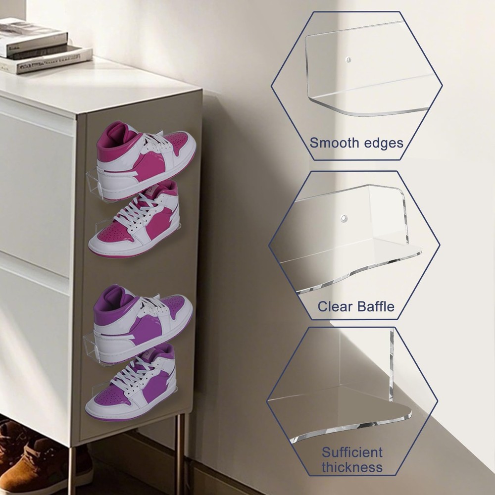 Elevate Your Sneaker Display with Crystal-Clear Brilliance Designed for Collectors, Perfected by Transparency Showcase your prized sneakers in style with our acrylic shoe racks, engineered to transform your collection into a museum-worthy display. Each pair of racks includes four rust-resistant screws for rock-solid stability, ensuring your kicks stay secure while their iconic soles steal the spotlight. Why Collectors Love It: 270 Visible Design: Highlight every detail—from vibrant uppers to signature soles—through ultra-clear, Scratch-resistant materials Customizable Height: Adjust tiers effortlessly to fit high-top Jordans, low-profile Converse, or chunky dad shoes. No measuring tools needed—simply align and tighten! Space-Smart Pair Display: Organize left and right shoes side-by-side like a pro, maximizing shelf space while keeping pairs instantly accessible. Gallery-Ready Aesthetic: Minimalist transparency blends into any decor, letting your sneakers (not the rack) become the room’s focal point. Perfect For: Sneakerheads curating Instagram-worthy collections Small-space dwellers needing vertical storage solutions Traders showcasing kicks in pristine condition Pro Tip: Stack multiple racks to create a floating effect—ideal for displaying grails in drop-front boxes! 【QUALITY MATERIALS 】Clear Floating Shoe Display Made Of Acrylic Material, Exquisite Workmanship Beautiful And Simple Shoe Wall Shelf, 270 ° Display Of Your Shoes, Maximum Visibility So That The Beloved Shoes Become Wall Art. 【PROFESSIONAL DESIGN】Each Of Our Floating Shoe Shelves Is Independent, You Can Adjust The Distance You Want According To The Height Of Your Shoes, Just Like Customising The Exclusive Shoe Display Shelf For Your Beloved Shoes, You Can Place The Wall Shoe Shelves At An Angle Or Parallel, And You Can Also Combine Them Into Different Arrangements According To The Wall Diy, No Middle Pole Design,Our Design Provides More Space For Your Imagination 【DECORATIVE SPACE】Wall Shoe Shelf Can Display Shoes In Different Angles, Is Your Space Eye-Catching Decorations, Floating Shelves For Shoes Suitable For Living Rooms, Bedrooms, Game Rooms, Dormitories, Corridors, Shoe Collection Showrooms, Shoe Shop Exhibitions And Other Scenarios,High Transparency Makes The Shoes Levitate In The Air As If By Magic, Very Cool 【EASY INSTALLATION】Includes One Pairs Of Shoe Holder For Wall, 4 Screws And Anchors, A Screwdriver And Instructions, Let You Have Your Own Shoe Shelves For Wall In Minutes, Individual Size Is 9.05 x 3.74 x 1.96 inch (l x w x h), Individual Maximum Weight: 4.4 lbs, Suitable For Trainers, High Heels, Martin Boots, Short Boots, Medium Boots And Sandals. 【BUY CONFIDENCE】Shoe Wall Display Is Suitable For All Kinds Of Wall, Whether It Is For Yourself Or For Your Family, Partner, Friends, Etc., Our Shoe Wall Mount Is The Perfect Gift, If You Pay Attention To Style And Quality, We Believe That Lixeszt Acrylic Shoe Rack Will Not Let You Down,If You Have Any Questions, Please Contact Us First