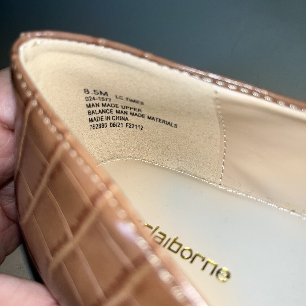 gtin13:Does not applyType:FlatOccasion:Casual, FormalStyle:LoaferUS Shoe Size:8.5Department:WomenUPC:Does not applyToe Shape:Closed ToeColor:BrownVintage:NoFeatures:ComfortBrand:Liz ClaiborneUpper Material:SyntheticCustomized:NoClosure:Slip On