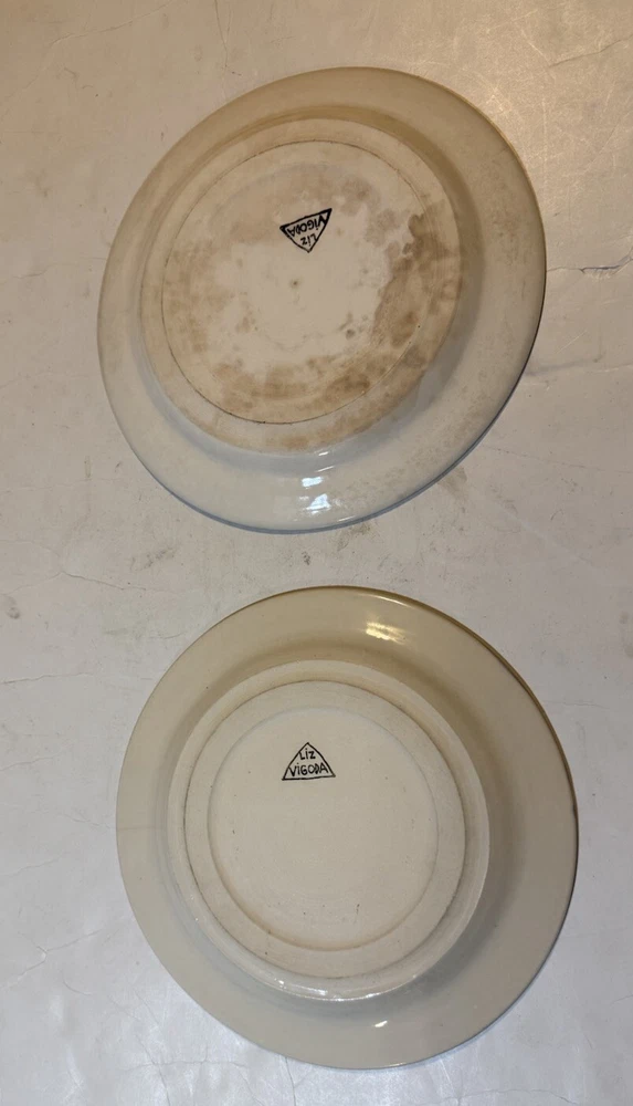 Add a touch of vintage charm to your dinner table with these beautiful Liz Vigoda fruit dinner plates. The set includes two plates, one 11-inch and one 10 3/4-inch, both featuring a vibrant fruit pattern with a contemporary style. These plates are handmade with glossy finish and made of high-quality clay material. They are perfect for all occasions and will make a great addition to your collection. Care instructions are included and recommend hand wash only. These plates are an original production with a painted backstamp. The set is a great example of art pottery from the late 20th century (1990-1999). They are in excellent condition and will be a great gift for your loved ones.