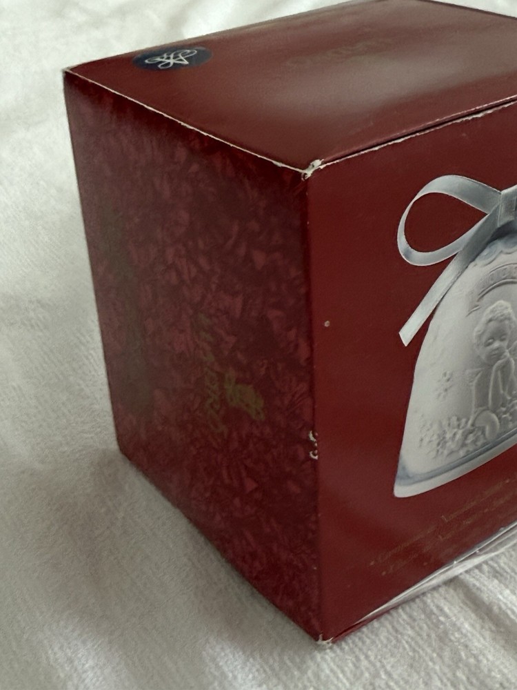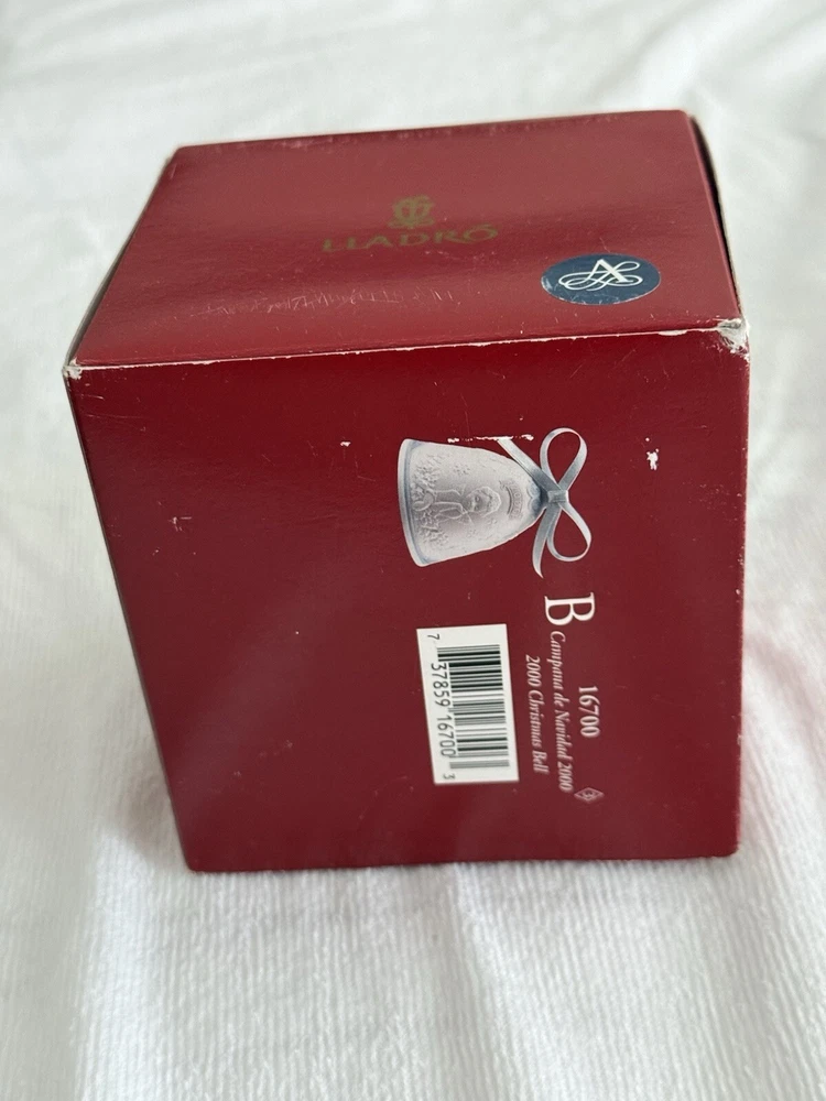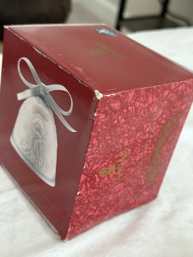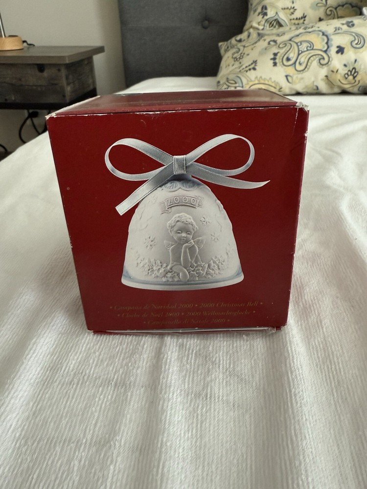 This Lladró Christmas Bell from 2000 is a small porcelain ornament with a bell shape. It features an angel design in white color and comes with its original box. The item is designed for adults and has a hanging feature. It is approximately 4 inches in length and weighs 6 oz. Perfect for Christmas decoration or as a collectible item.