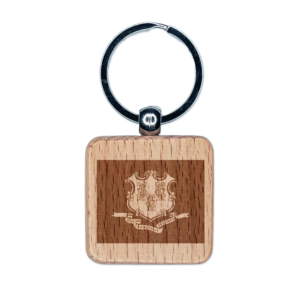 Llavero cuadrado de madera grabado con bandera del estado de Connecticut etiqueta