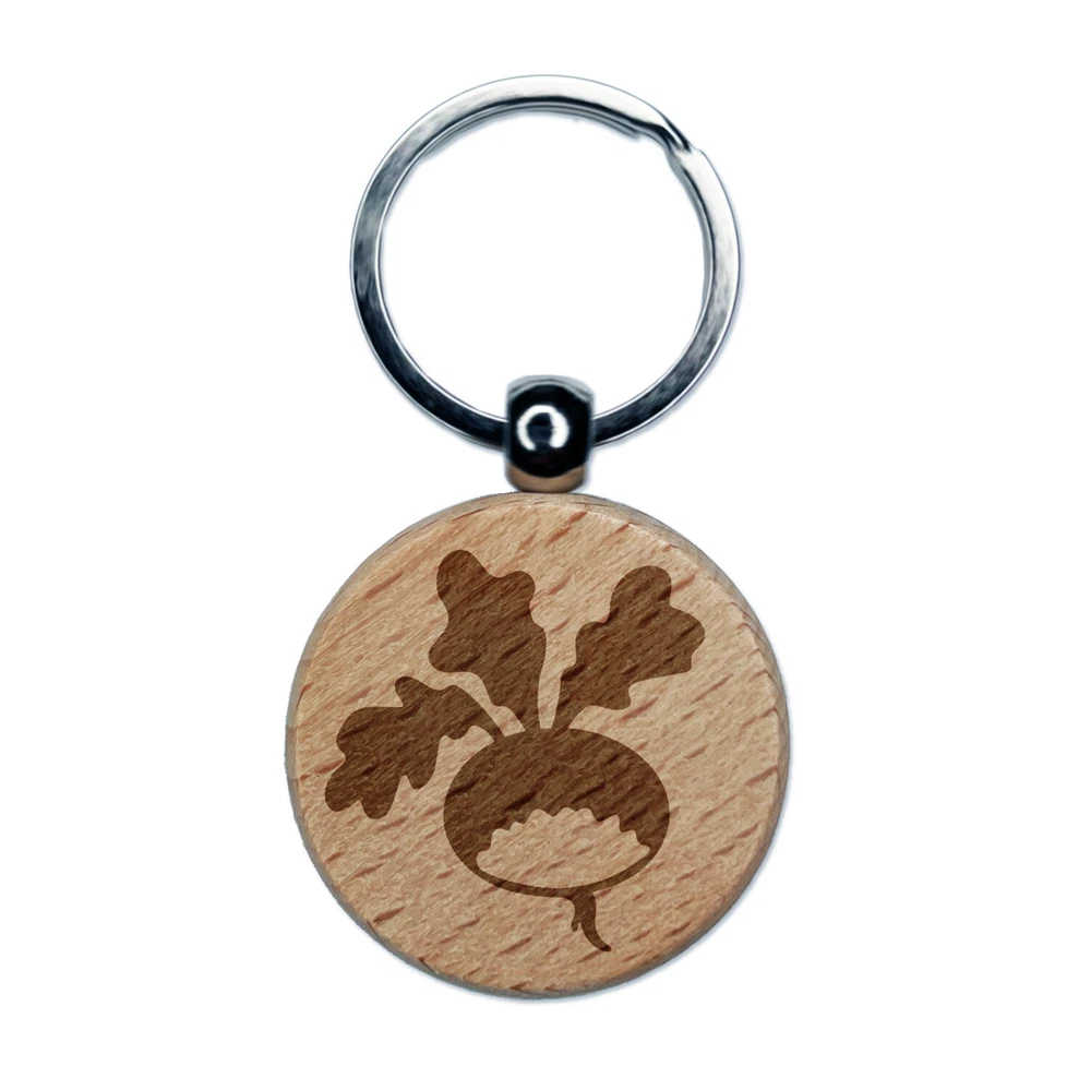 Llavero redondo de madera grabada de rábano huerto de jardín con etiqueta