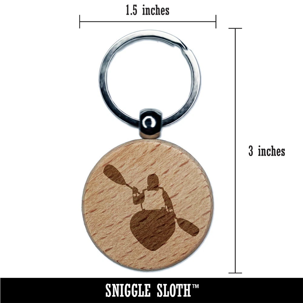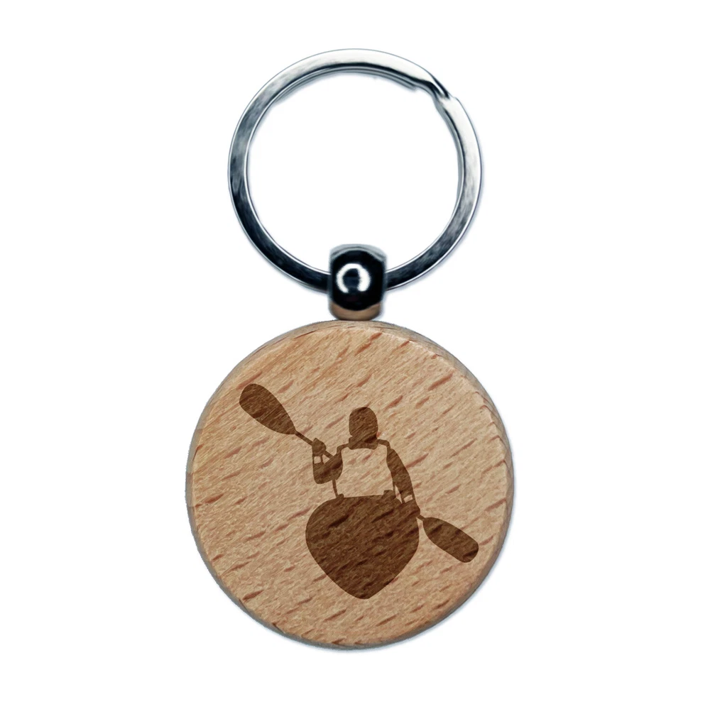 Llavero redondo de madera grabada en kayak para persona con espalda de remo
