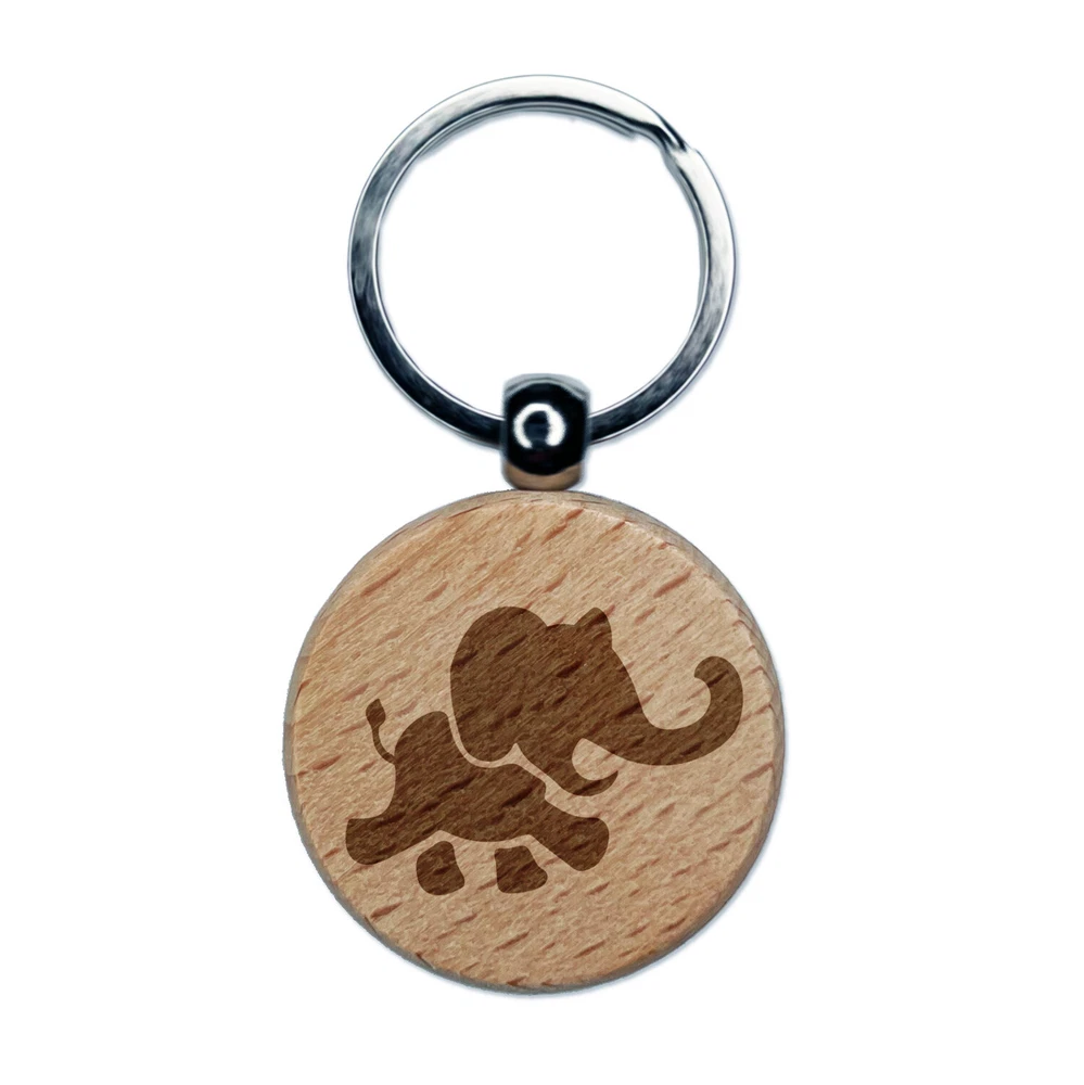 Llavero redondo grabado en madera para bebé elefante en marcha con etiqueta