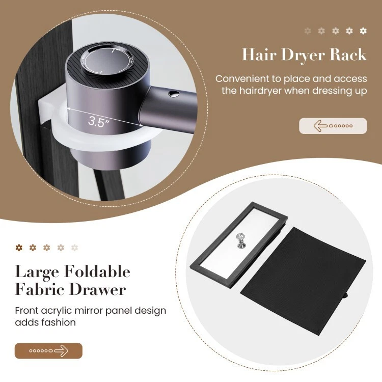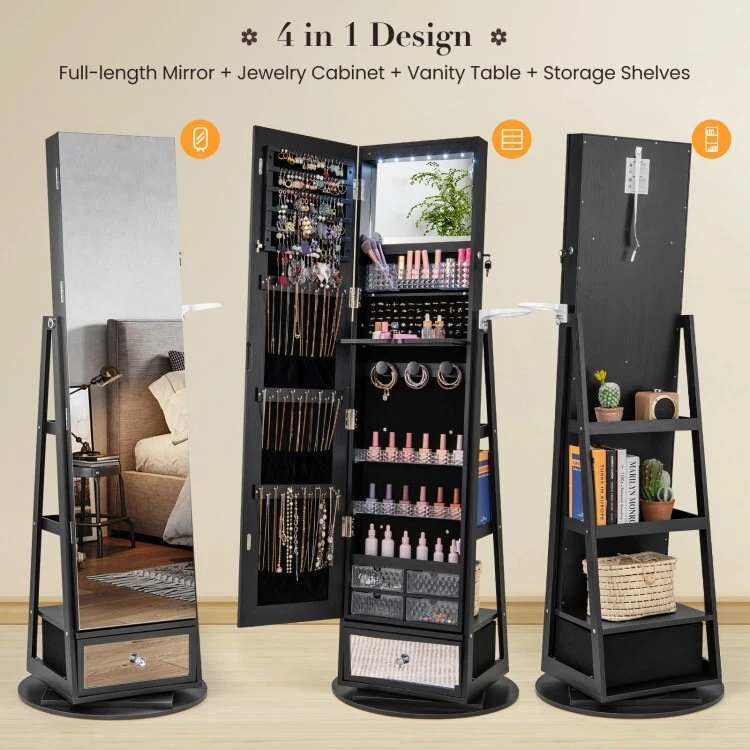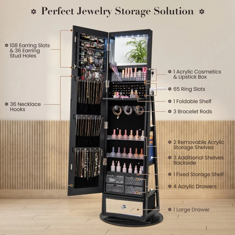 Lockable 360° Swivel Jewelry Organizer Cabinet W/LED Lights & Full-Length Mirror ● Perfect Jewelry Storage Solution: Equipped with 108 earring slots, 36 earring stud holes, 36 necklace hooks, 1 acrylic cosmetics and lipstick box, 65 ring slots, 3 bracelet rods, 2 removable acrylic storage shelves, 1 fixed storage shelf, 4 acrylic drawers, 1 large drawer, this jewelry armoire can keep all your treasures well organized. ● Multifunctional 3 in 1 Design: The floor standing jewelry cabinet features a 55" x 14.5" full length and full screen mirror to provide you with a wide field of view from head to toe. What's more, with 3 additional shelves backside, the jewelry armoire can also serve as a storage rack or display stand. ● Built-in Mirror and LED Lights: There is a small vanity mirror inside of the jewelry cabinet. Along with the bright LED lighting, it is convenient for you to make up. The lights are powered by 3 x AAA batteries (not included) . Besides, the foldable acrylic makeup shelf can be flipped down to place cosmetics during your makeup. ● Upgraded Convenience and Chic Design: This mirrored jewelry cabinet comes with a hair dryer rack, making it convenient to place and access the hairdryer when dressing up. In addition, the large foldable fabric drawer at the bottom with a front acrylic mirror panel design adds fashion. ● 360° Smooth Swivel and Safety Lock: Thanks to the flexible 360° rotating design, you can easily fetch items stored at the back of the jewelry cabinet. Plus, the jewelry armoire features a lockable door with keys to keep your belongings safe, while the magnetic catch design prevents the door from unwanted opening. Color: Black Material: MDF, Glass, Acrylic Product Dimension: 22" x 64.5" External Mirror Size: 55" x 14.5" Internal Mirror Size: 13.6" x 9.4" Large Drawer Size: 14.2" x 11.8" x 5.7" Small Drawer Size: 6.5" x 2.4" x 2.6" Inner Diameter of Hair Dryer Rack: 3.5" Thickness of Cabinet: 4" Net Weight: 54 lbs