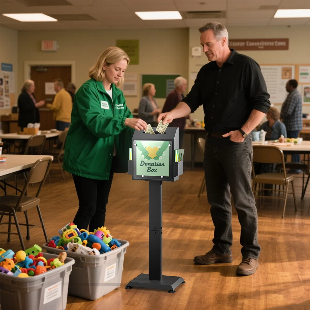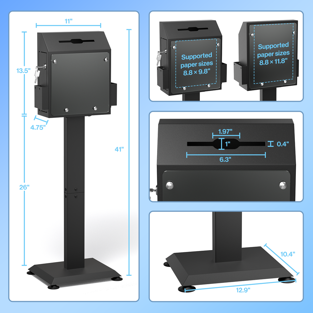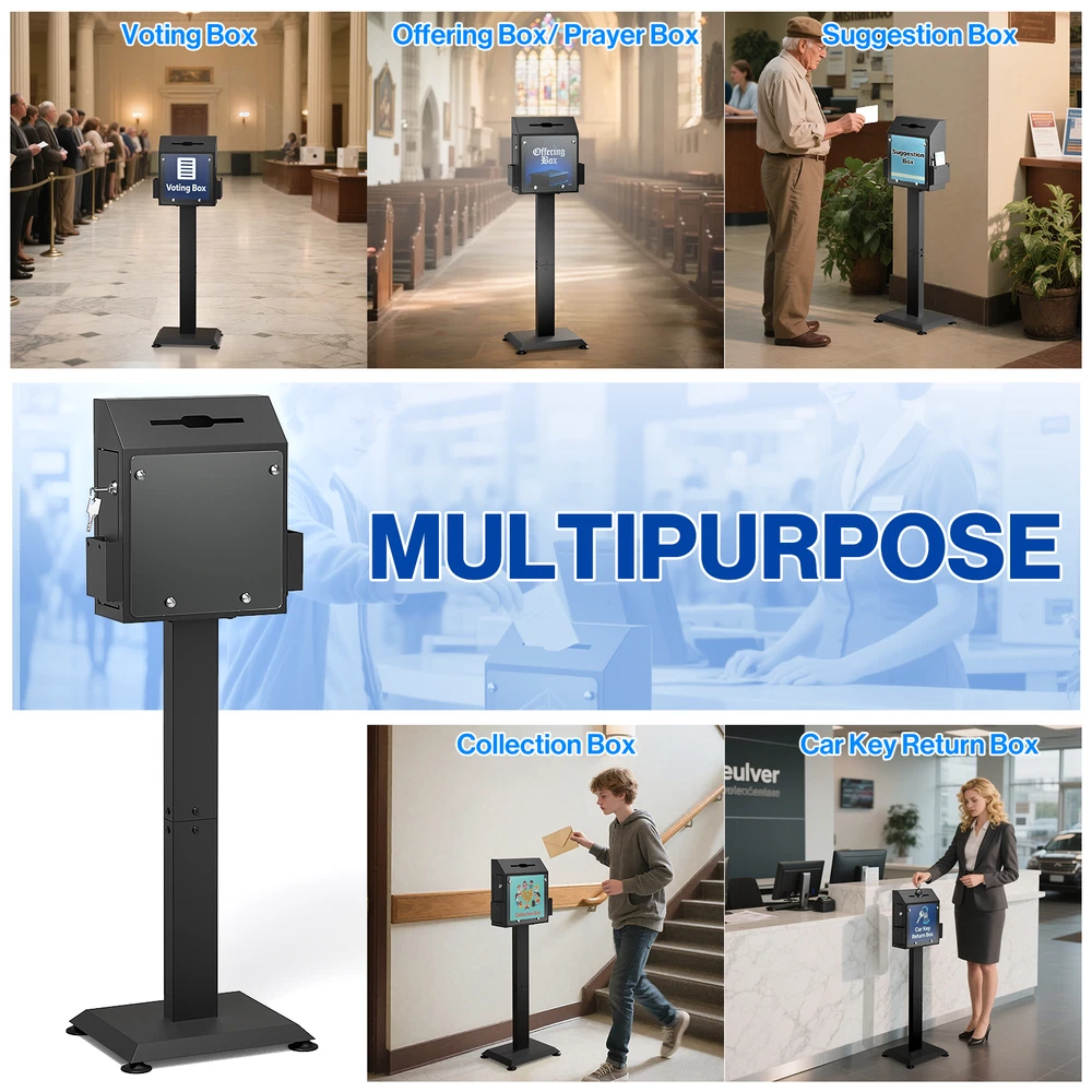 POCHAR Metal Donation Box for Fundraising - Suggestion Box with Stand, Slot & Lock - Locking Offering Boxes for Church, Floor Standing Prayer Voting Collection Ballot Boxes for Charity Election Events About this item FLOOR STANDING SUGGESTION BOX: POCHAR comment box features a robust steel stand and base with suction cups, ensuring the steady that does not shake or move during using. Made from durable cold-rolled steel, this comment box is engineered for long-term in high-traffic environments, unlike fragile acrylic alternatives. DONATION BOX WITH LOCK: This donation box for fundraising features a secure key lock on the side door (with 2 keys), keep the donations, ballots, or interior items security and privacy. And the voting box is equipped with a clear acrylic display plant for posters, announcements, or instructions to encourage participation. LARGE STORAGE SPACE: Standing at 41.7" tall, the offering box has a slot measuring 6.5" x 0.2", accommodating money, ballots, keys, cards or envelopes up to 6" wide. With a spacious storage capacity of 692.78 cubic inches, you won’t need to open it frequently due to fullness. MULTI-PURPOSE: Two side trays hold suggestion cards, questionnaires, brochures, or envelopes for easy access. Ideal as a offering box or prayer request box for churches, wedding card box, lobby or reception suggestion box, voting box for elections or schools, and key return collection box in car rental centers or hotels. HASSLE-FREE ASSEMBLY: Includes clear instructions for quick setup in just four steps. Start collecting feedback, ballots, or donations immediately. Perfect as collection box, raffle ticket box, advice box, complaint box or business card drop box for churches, hospital programs, offices, charity events, election centers, community organizations and public spaces. Check our eBay Store Front for more product listings! POCHAR Sales | eBay Stores Thanks for shopping POCHAR! The actual color of the product may be different from the image you see. This is due to the fact that every computer monitor, laptop, tablet and phone screen has a different capability to display colors and that everyone sees these colors differently. We try to edit our photos to show all of our products as life-like as possible, but please understand the actual color may vary slightly from your monitor.