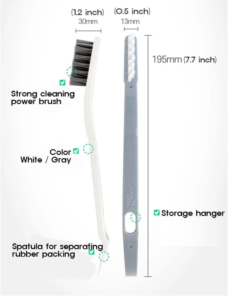 LocknLock Airtight Food Container Crevice Cleaning Brush (Pack of 2) White Product Details Brand: LocknLock Color: White Handle Material: Plastic Specific Uses For Product: Kitchen, Dish Set Material: Rubber Special Feature: Grip Handle, Hanging Loop Shape: Rectangular Included Components: Scraper Theme: Cleaning Manufacturer: LockNLock Unit Count: 2.0 Count Product Dimensions: 7.7 x 0.5 x 1.2 inches Item Weight: 9.6 ounces It is a rubber packing cleaning brush inside the lid of an airtight container. Applicable to Lock & Lock and similar products. It is useful to remove dirt caught between the lid and the rubber packing. Easy rubber packing removal spatula. It is convenient to use in crevices. Color : White and Gray Crevice Cleaning Brush Length : 7.7 inch(19.5cm) Introducing our revolutionary cleaning tool designed specifically for those hard-to-clean corners of airtight containers and stubborn residues in rubber packing on lids. Say goodbye to frustratingly unreachable areas and say hello to pristine cleanliness with our innovative solution.