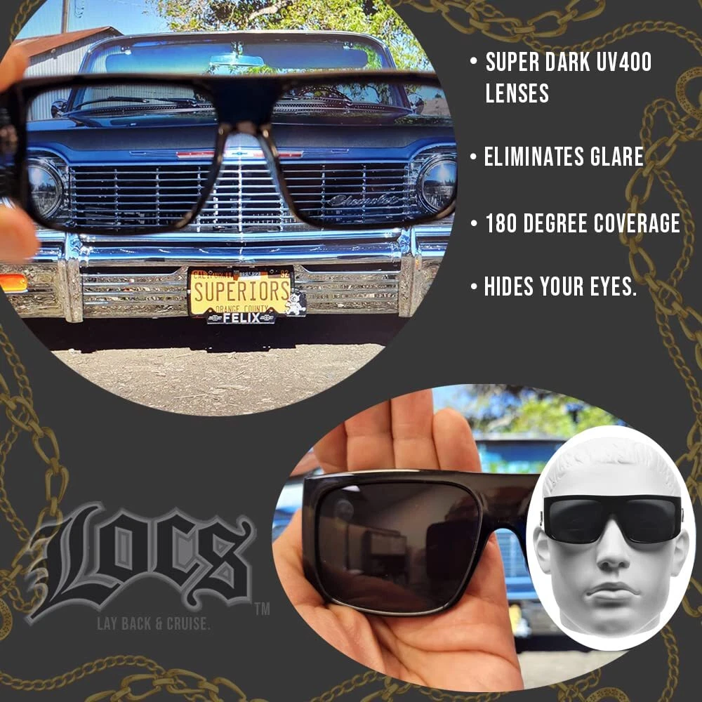 Welcome to the world of LOCS Bad _ss shades. LOCS are not for everyone. Do you have the attitude? Do you have the swagger? Can you walk the talk? Show your true colors with a genuine pair of LOCS shades. These are genuine LOCS, constructed of durable hand polished polyamide nylon frame. Sport your LOCS laid back in your ride cruising down the blvd or just chilling on Miami Beach sipping on your margarita. Super dark lens lets you check out the scene inconito. Each LOCS style fits a specific range of head size. Store your LOCS in the complimentary free super soft microfiber cleaning cloth. Are you ready to live the life? It's time to order your LOCS now. 100% AUTHENTIC LOCS SUNGLASSES : Proudly worn by lowriders, cholos, bikers and gangster around the world. Locs Sunglasses define freedom, individualism and expression. Locs sunglasses are iconic. Locs have history, and Locs can hold their own in any battle. SUPER DARK SUNGLASSES : Super dark lenses provide maximum protection against bright sunlight and also conceal your eyes. Super dark lenses are excellent for driving and filter more sunglight than regular sunglasses. 100% UV PROTECTION : Locs Sunglasses provide 100% UV protection and are “UV400” rated, meaning the lenses will block UV light up to 400 nanometers (100% UVA & UVB rays). Prolonged exposure to the sun’s harmful UV rays can cause damage to your eyes. WRAP SUNGLASSES WITH POLYCARBONATE LENSES : Blocks UV rays, wind and debris from all angles. Wrap sunglasses also filter out UV rays that bounce off the inside of your lenses if the sun is behind you. Wrap sunglasses keep your eyes comfortable and safe. Whether you chill out in L.A, Chicago, New York, Miami, San Antonio, or Dallas; Locs sunglasses are built for protection and versatility. LOCS SUNGLASSES FOR MEN & WOMEN : Unisex style designed for men and women. Choose larger frames for more gangster attitude.