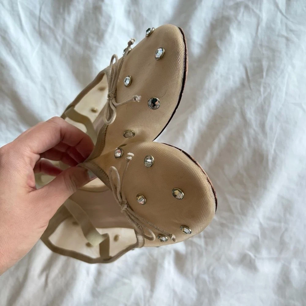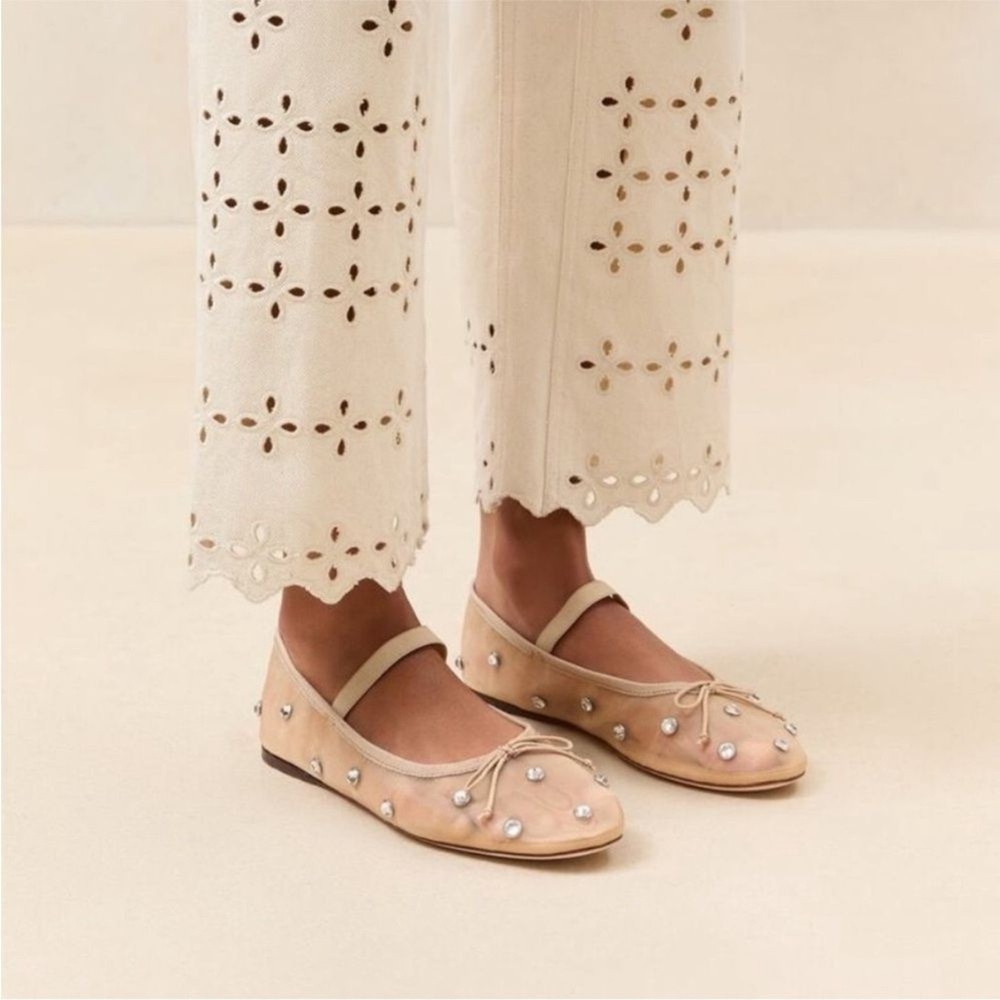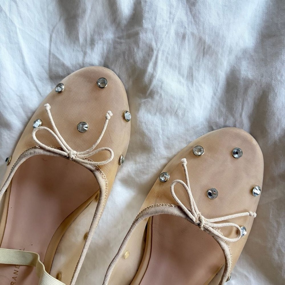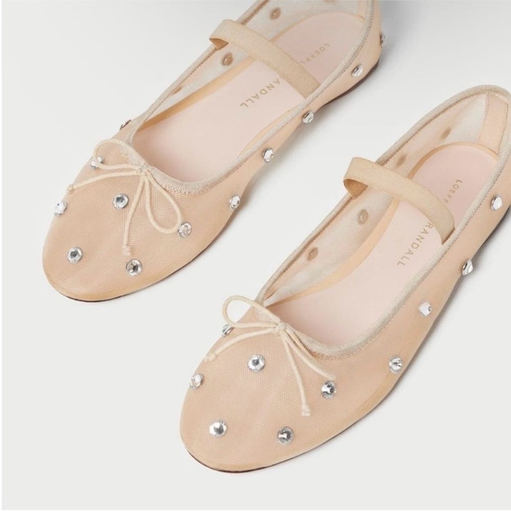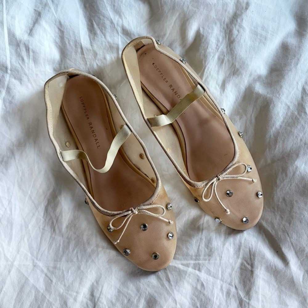 Loeffler Randall soft ballet flat in caramel mesh with clear crystal embellishment, an elastic bridge strap, and bow detail. Features a padded footbed with gold stamped logo and an almond toe. Size 8. Worn but in great condition, no noticeable flaws.