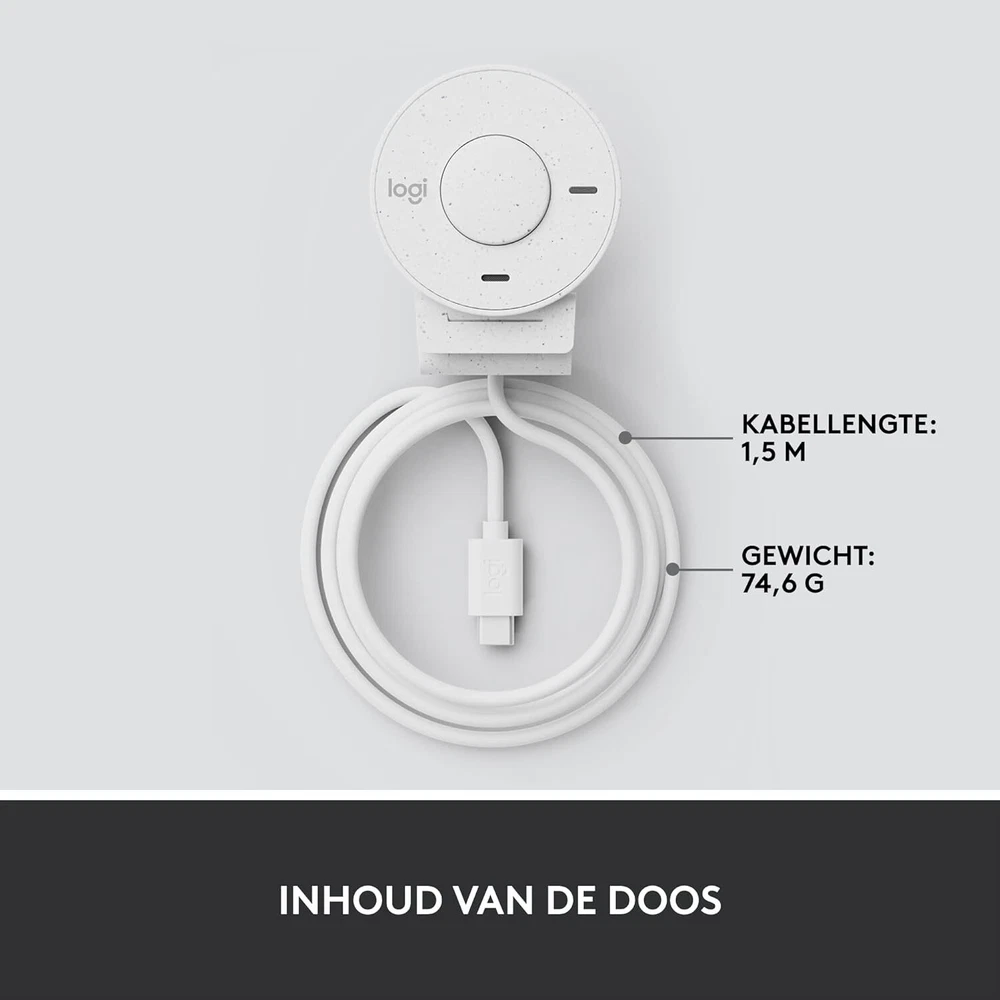 Further Details Title: Logitech Brio 300 Full HD Webcam with Privacy Shutter, Noise Reduction Microphone, USB-C, Ceritified for Zoom, Microsoft Teams, Google Meet, Auto Light Correction, Streaming Webcam - White Condition: New Type: Stands Description: Say hello to better video meetings. Place Brio 300 at your best angle for an eye-to-eye connection. Look natural thanks to 1080p resolution and auto light correction for low-light situations. A noise-reducing mic suppresses background noise so others can hear you clearly. Spin the easy-to-use privacy shutter to cover the lens between calls. Brio 300 is certified for Microsoft Teams, Google Meet, and Zoom, so you can enjoy hassle-free meetings. Add a dash of personality to your workspace with a modern shape and a subtly speckled design made from at least 48% recycled plastic. (3) (1) Download free Logi Tune for a customized experience. Logi Tune app currently supports headset voice prompts in the following languages: English, French, German, Italian, Spanish, and Portuguese. (2) Logi Tune not available for Chrome OS (3) Webcam plastic content may vary by color. Excludes Electronic (EE) Components, cables, and packaging. 62% for Graphite and Black, 48% for Off-white and Rose. Brand: Logitech Color: White Size: one size Connectivity: USB Screen Size: 2.7 Inches MPN: 960-001442 Language: Engels Country/Region of Manufacture: China Item Length: 45mm Item Width: 53mm Item Height: 65mm Item Weight: 74.6 Gramsg Manufacturer Warranty: Three year warranty. Dimensions: 45 x 53 x 66 millimetres Be Your Best Self on Every Video Call: Full HD 1080p webcam resolution provides natural image quality, so you look like the real you on all meeting apps Auto Light Correction: RightLight 2 technology automatically compensates for poor video lighting conditions so you can be seen clearly Sound Like You: The mono noise reduction mic suppresses background sound so everyone on the call can hear you easily Spin for Instant Privacy: Spin the webcam privacy shutter to block the camera lens when you don’t need to be on screen Made for Meetings: Brio Webcam 300 is compatible with most video conferencing platforms and certified for Zoom, Microsoft Teams and Google Meet Logi Tune: Enjoy the free app (1) (2) to customise your video experiences such as adjusting colour and image quality Brio 300 is made with minimum 48% post-consumer recycled plastic for a better future (2) This product has been certified to meet Google's compatibility standards. Google is not responsible for the operation of this product or its compliance with safety requirements Be Your Best Self on Every Video Call: Full HD 1080p webcam resolution provides natural image quality, so you look like the real you on all meeting apps Auto Light Correction: RightLight 2 technology automatically compensates for poor video lighting conditions so you can be seen clearly Sound Like You: The mono noise reduction mic suppresses background sound so everyone on the call can hear you easily Spin for Instant Privacy: Spin the webcam privacy shutter to block the camera lens when you don’t need to be on screen Made for Meetings: Brio Webcam 300 is compatible with most video conferencing platforms and certified for Zoom, Microsoft Teams and Google Meet Logi Tune: Enjoy the free app (1) (2) to customise your video experiences such as adjusting colour and image quality Brio 300 is made with minimum 48% post-consumer recycled plastic for a better future (2) This product has been certified to meet Google's compatibility standards. Google is not responsible for the operation of this product or its compliance with safety requirements Missing Information? Please contact us if any details are missing and where possible we will add the information to our listing.