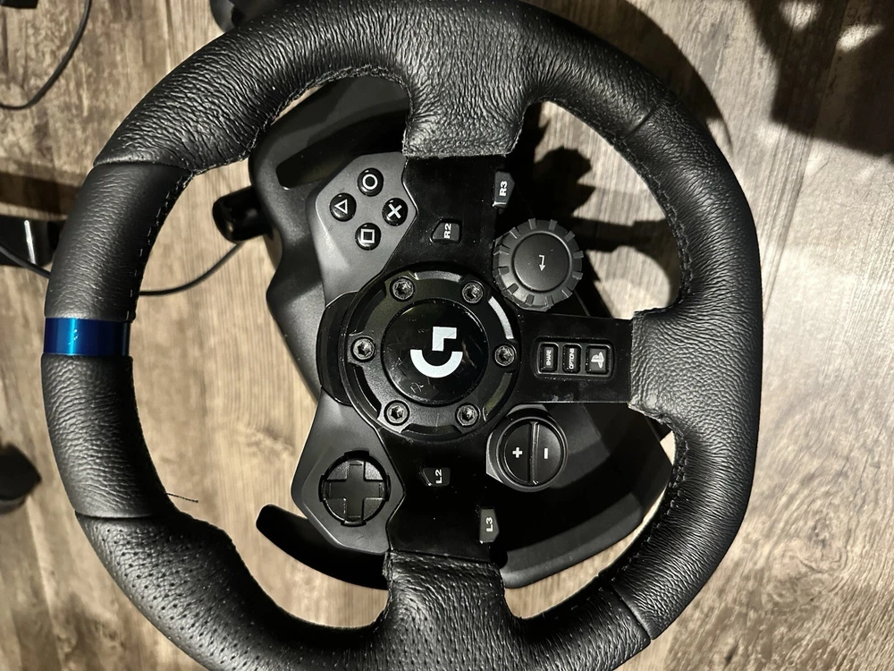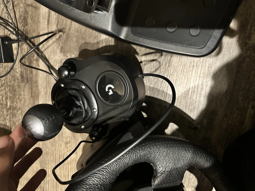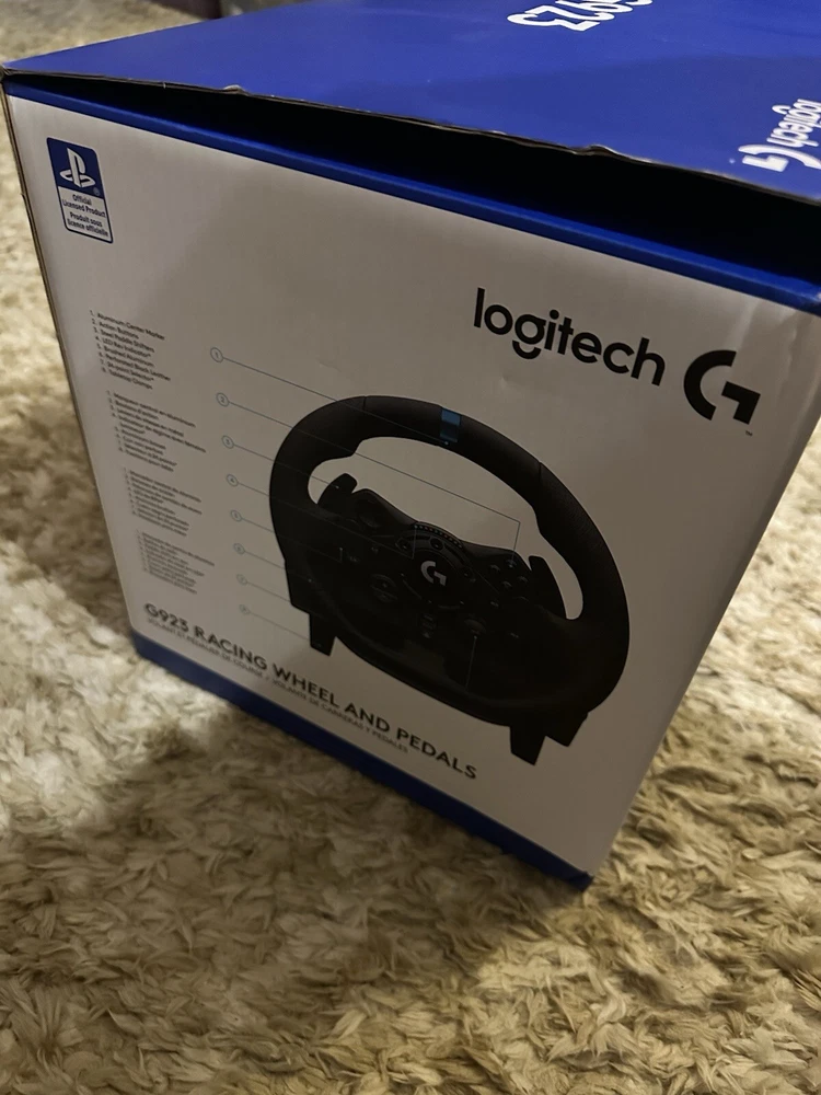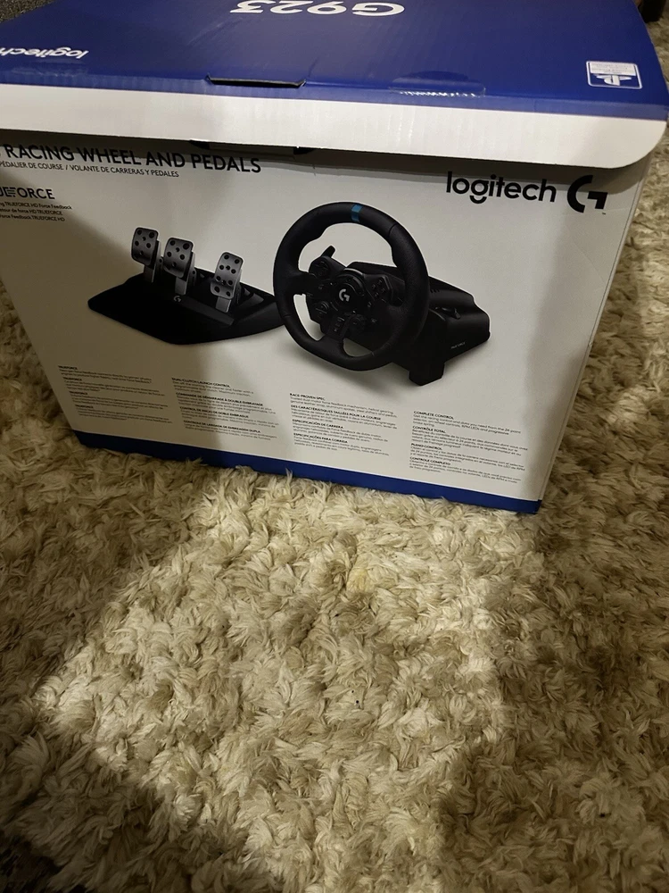 Logitech G G923 USB Steering Wheel + Pedals PC, Xbox - Black I’ve had it for a while but everything works box is in good condition there’s just a little wear on the wheel from resting it on the pedals to put away when not in use It does come with a shifter but it sometimes goes into R gear or 6th gear instead of going right into 6 gear it’s common for their shifters and should be an easy fix I just don’t have time to do it. Only selling because I want to upgrade