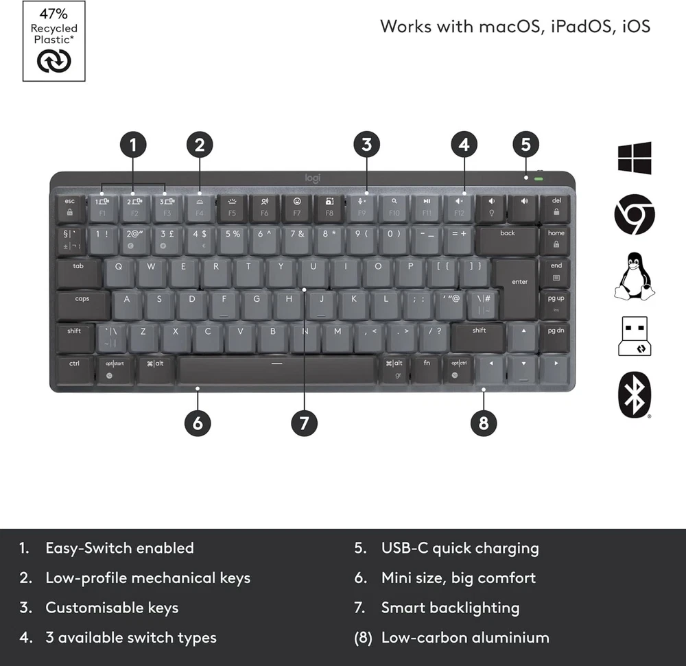 ::: Logitech ::: ITEM DESCRIPTION Logitech MX Mechanical Mini Minimalist Wireless Illuminated Keyboard-GRAPHITE - US - Refurbished • Fluid and quiet mechanical typing: MX Mechanical Mini keyboard features Tactile Quiet switches that deliver next-level feel and flow with less noise - Clicky and Linear switches are also available. • Low-profile keys, more comfort: A keyboard layout designed for effortless precision, with a small, compact form factor and low-profile mechanical switches for better ergonomics. • Smart illumination: Backlit keys light up the moment your hands approach the cordless keyboard and automatically adjust to suit changing lighting conditions. • Faster workflow, more customisation: Customise Fn keys, assign backlighting effects, enable Flow cross-computer, multi-device control, and more in the improved Logi Options+. • Multi-device, multi-OS: Pair MX Mechanical Mini Bluetooth wireless keyboard with up to 3 devices on nearly any operating system via Bluetooth Low Energy or included Logi Bolt receiver. • USB-C quick charging: MX Mechanical Mini keyboard stays powered up to 15 days on a full charge or up to 10 months with the backlighting turned off. • MX Mechanical full-size: If you crunch numbers frequently, a full-size keyboard form factor with an integrated numpad is also available BOX CONTENTS Keyboard Logi Bolt receiver USB-C charging cable (USB-A to USB-C) User documentation PLEASE NOTE: This product comes with One (1) year Limited Hardware warranty. Delivery Returns Warranty About Delivery Information All orders are dispatched within 1 working day upon cleared receipt of payment. We use reputable, tracked and insured couriers (normally Royal Mail) to deliver our items, with a transit time of 1-3 working days but this could increase slightly depending on delivery location or if we are in a peak trading period such as Christmas. We currently ship to UK addresses only. For any delivery related queries, please contact our team via the eBay messaging system and we will look to respond to any inbound enquiry within 1 working day of receipt. Returns Information We want you to be satisfied with the quality of the products you purchase from us. If at any time within 60 days of receiving your order, you are not 100% satisfied, you may return it to us for a refund or replacement. Please contact us via the eBay messaging system to arrange your return. Products must be returned in their ORIGINAL box, including device, charger, battery, instructions, and other components where applicable. All returned products must be in the same condition as when they were received. If an item becomes faulty after 60 days it qualifies for a warranty claim up to 1 year from receiving your order. In order to arrange a warranty return, please contact us via the eBay messaging system and we will provide further instructions. Once your returned item has been received and checked, either a refund will be initiated via eBay or alternatively a replacement item can be arranged. In all cases of returns, please contact us via the eBay messaging system first. We will look to respond to any inbound inquiry within 1 working day of receipt. Warranty Information All items sold through our Official Outlet carry a 1 year manufacturer’s warranty. In the case of a warranty query, please contact us via the eBay messaging system and we will look to respond to any inbound enquiry within 1 working day of receipt. About us Welcome to the official Logitech eBay UK outlet where you can find a wide range of our award-winning branded products in both new and certified refurbished conditions. All items offered are from the manufacturer direct and are covered by our standard UK warranty policy. We are the only authorized seller on eBay UK for Logitech, Logitech G, Ultimate Ears, Blue Microphones, Astro, and Jaybird. Therefore rest assured when shopping with us that you are buying a genuine and authentic product that will be expertly shipped to you directly from our UK warehouse using reputable couriers. Our UK customer service team is also on hand should you ever have an issue or question, your peace of mind when buying from us is our number one priority. Thank you for shopping with us and welcome to the wonderful and innovative world of Logitech!