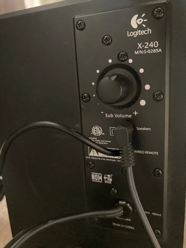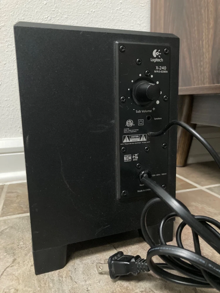 Pump up the volume with this set of Logitech X-240 Speakers. Accepting offers. 2.1 channel surround/satellite system comes with a subwoofer and supports THX and Dolby Digital surround sound formats. Plug the headphone jack into your projector (as shown) for an immersive movie experience. Rectangular-shape, black crystal material speakers function with a wide range of brands and models, making them versatile. Easy to set up and compatible with any 3.5mm jack. Plug into your laptop or MacBook’s headphone port or to your PC for the ultimate gaming experience. Bluetooth dongle included as shown in photos. (Compatible with iPhone) -Wired speakers -RMS power of 50 W -Audio inputs for AUX and a 3.5 mm jack. -Adjustable subwoofer power -Additional port for headphones with easy volume control and hideaway cellphone cradle Disclaimer: Used speakers and woofer, small crinkle at the base of subwoofer cone. Does not affect sound quality. Detachable wired speakers will come with subwoofer in padded box for safety.