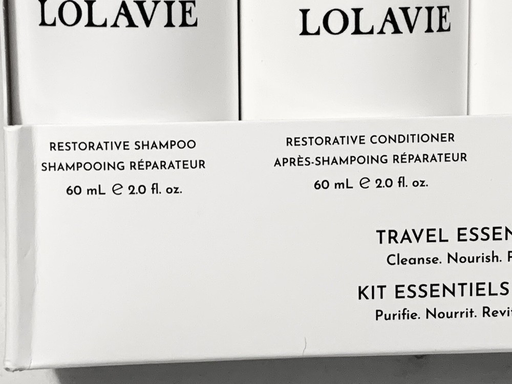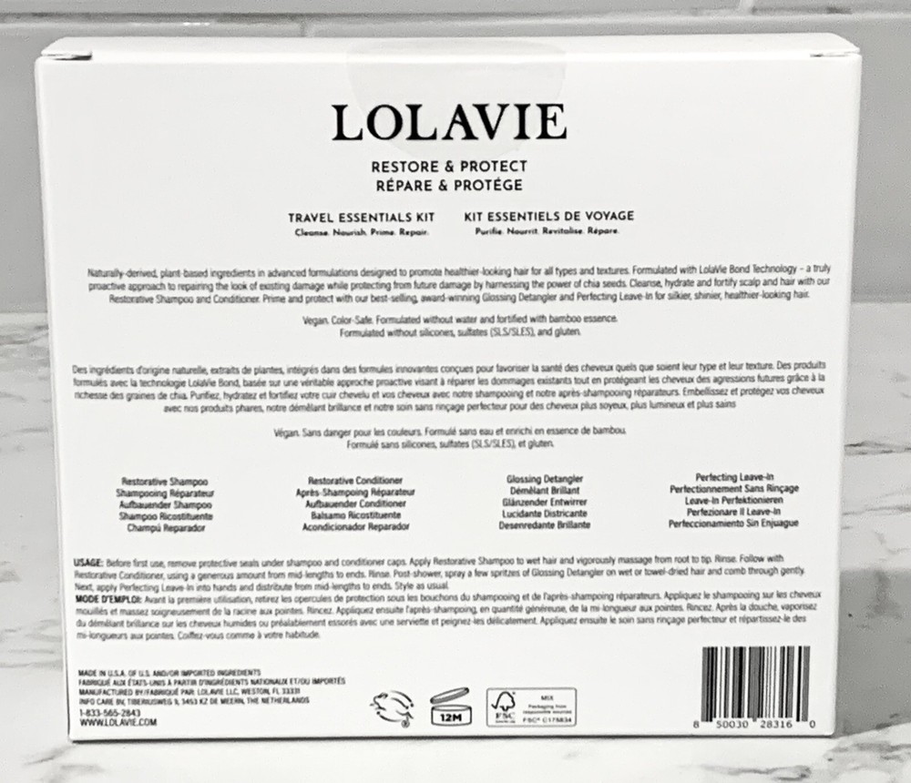Lolavie Travel Set Restorative Shampoo, Conditioner, Detangler, Leave In Each bottle is 2 oz Box is sealed