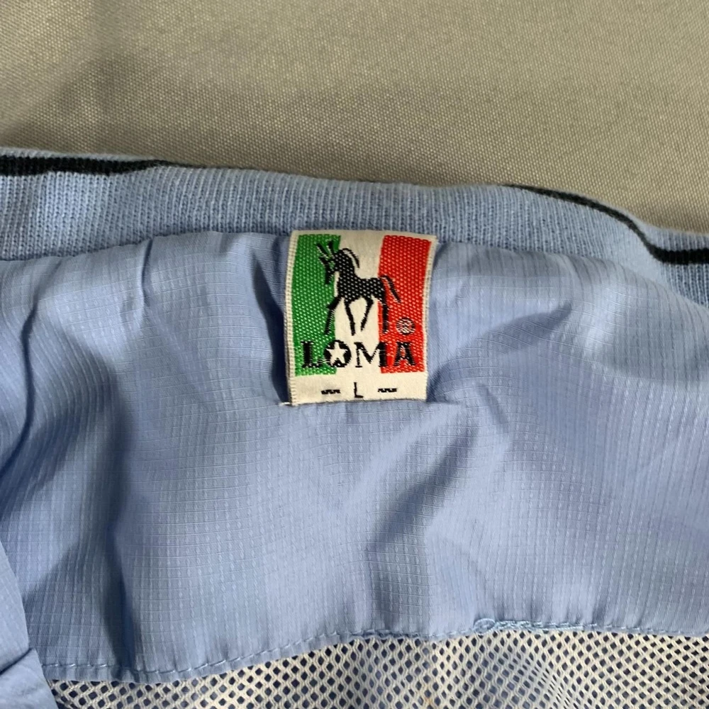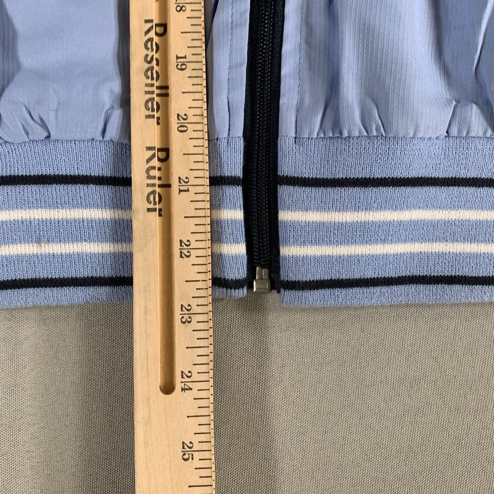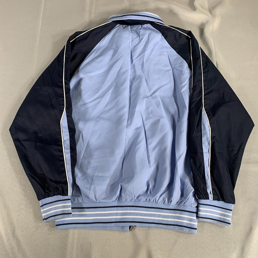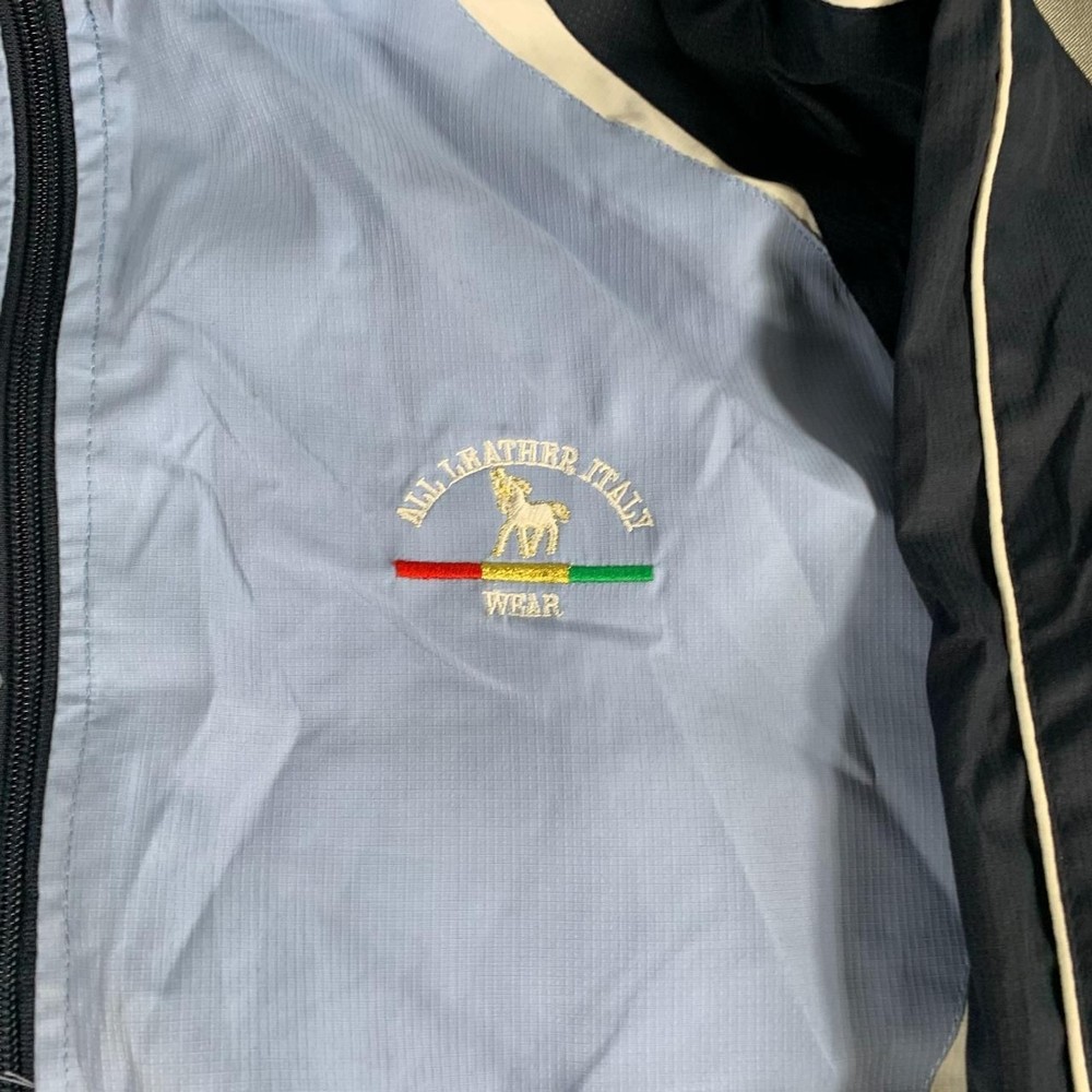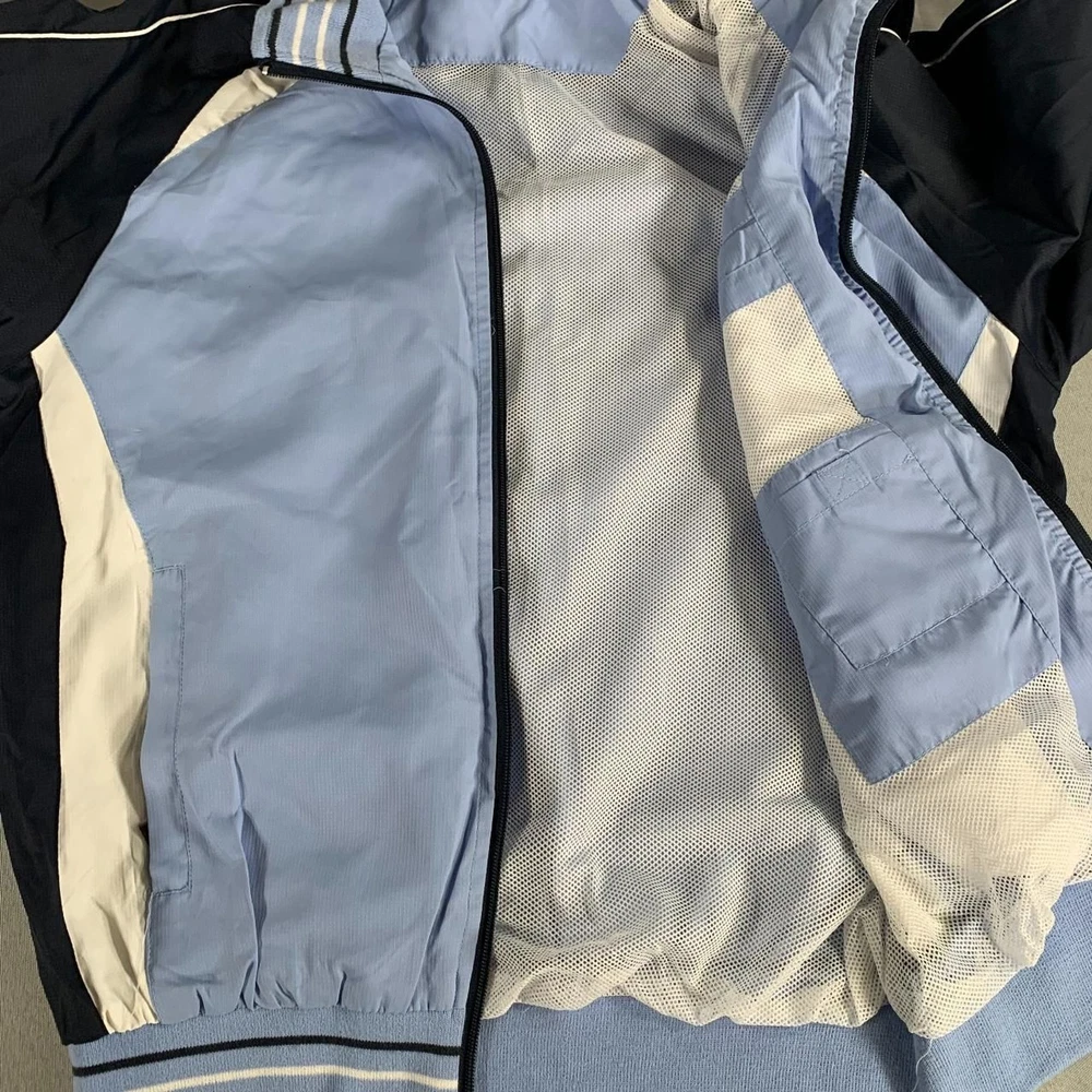 Vintage-style Loma windbreaker from All Leather Italy Wear Size L | Approx 25” Length x 23” Pit to Pit (see pics for measurements) Retro colorblock navy & sky blue w/ white piping Breathable mesh lining + zip front + striped cuffs & hem Sick Y2K athletic look! Clean, bold, lightweight & perfect for layering. Excellent pre-owned shape. Minor wrinkling only—ready to wear! SKU: 5685