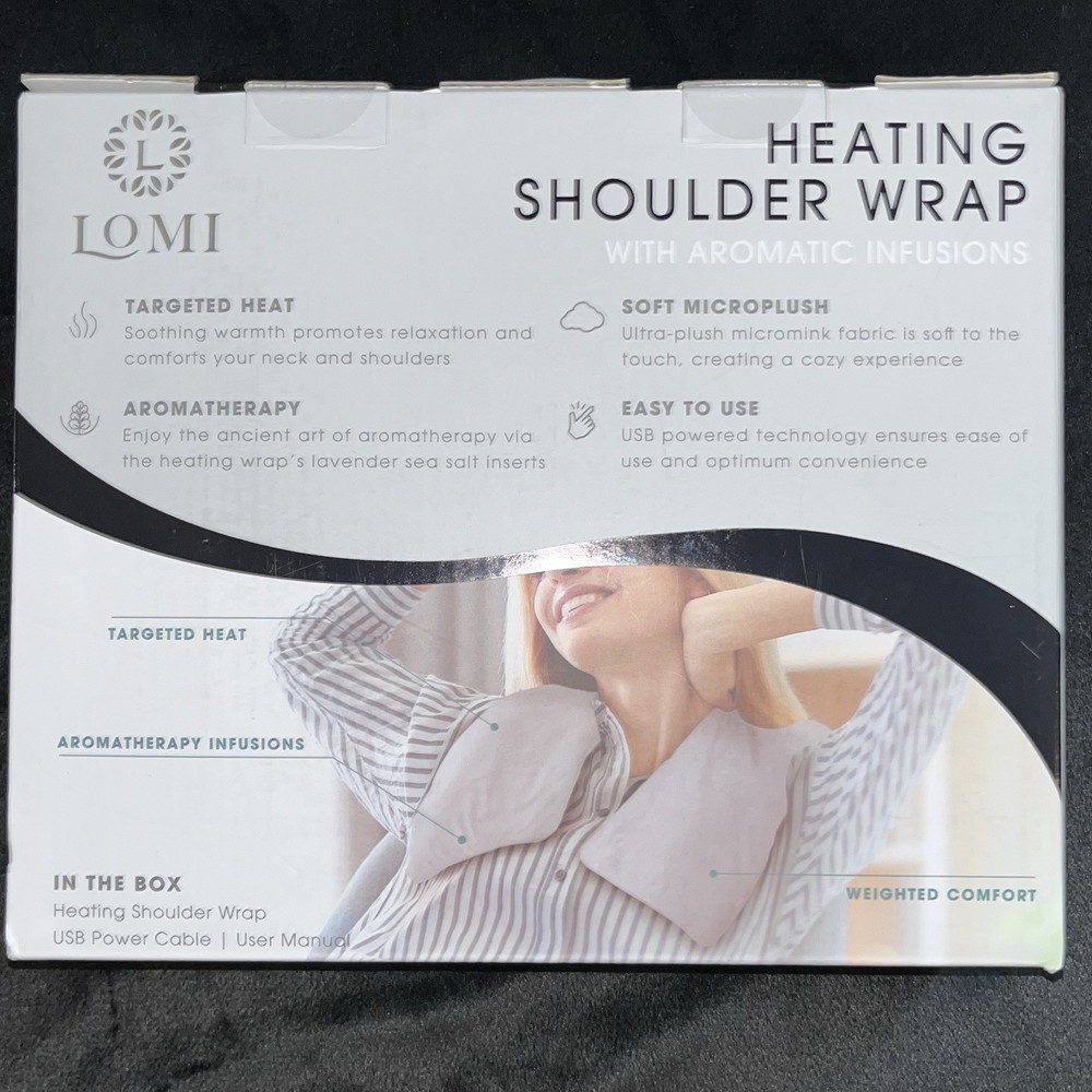 The Lomi Heating Pad Shoulder Wrap is a unisex electric heating pad designed for relaxation and recovery from aches and pain. Infused with aromatics, this gray fabric heating pad provides soothing warmth with the convenience of a USB power source. Made in China, this product offers a comfortable and versatile option for those seeking relief and relaxation for their shoulders and upper body.