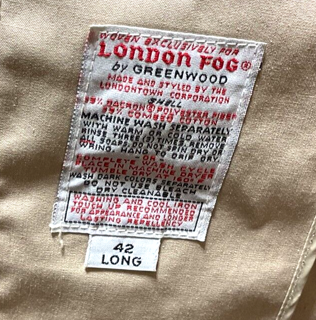 This London Fog Men's Winter Trench Coat in size 42 Long features a classic Vintage style with a Beige Solid color. Made of Polyester/Cotton blend fabric, it has a Polyester lining and a zip-out liner for versatile wear in Winter, Fall, and Spring. The five-button front and long length add a formal touch suitable for business, travel, weddings, parties, or casual occasions, making it a timeless and stylish outerwear option for men seeking a classic look with a vintage flair.
