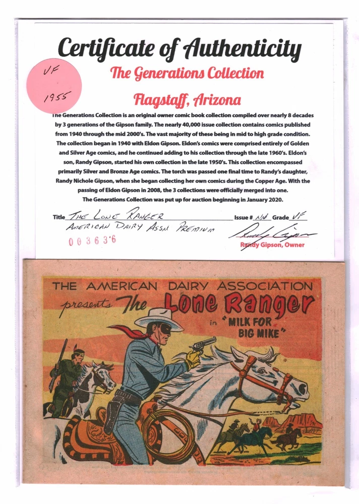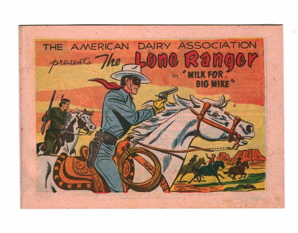 U. S. Bidders ONLY for this item. No International Shipping. THE LONE RANGER AMERICAN DAIRY ASSOCIATION PREMIUM "Milk for Big Mike" Graded Very Fine 1955 Western Printing - Golden Age Pocket size (7" x 5") 16 pages Not distributed to stores Only available as a give-away from the American Dairy Association Overstreet Comic Book Price Guide Value in THIS condition $58.00 * * * * * * * THE GENERATIONS COLLECTION FLAGSTAFF, ARIZONA The Generations Collection is an original owner comic book collection compiled over 8 decades by 3 generations of the Gipson family. This nearly 40,000 issue collection contains comics from 1940 to present day. Note: Not all of the comics that we sell are from the Generations Collection. Generations Collection comics can be identified by an ORANGE grading sticker on the upper left corner of the comic storage bag. All Golden, Silver and select Bronze Age comics from the Generations Collection come with a signed and serialized Certificate of Authenticity. All packages are insured for up to $100.00 at no additional charge. If you desire additional coverage, contact the seller before making payment. All comics and magazines come individually bagged and boarded. Shipped in padded envelopes & sandwiched between 4 pieces of cardboard. MAXIMUM U.S.A. SHIPPING IS $8.95 NO MATTER HOW MANY COMICS YOU BUY! (Excludes CGC & PGX Graded Comics) I will combine shipping costs for winners of multiple auctions. Combined shipping costs apply to auctions won during the SAME calendar week. U. S. Bidders ONLY for this item. No International Shipping. Track Page Views With Auctiva's Counter