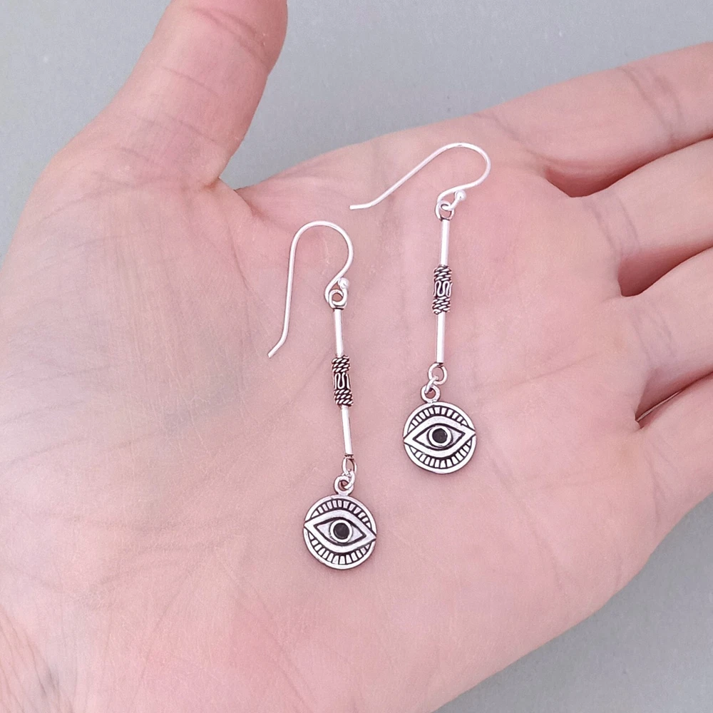 Protective Evil Eye long dangle earrings in sterling silver. Nickel FREE. Round Evil Eye long dangle earrings is sterling silver. Cute oxidised eye symbol charm hanging from an ornate bar, evoking ethnic patterns and a typically Boho style. A very popular symbol to ward off negative vibes and protect the wearer. Meaningful jewellery gift for her. Buy Now! Dimensions: Drop length including hooks: 5 cm Diameter: 1 cm Total weight approx: 2.45 grams. Delivery Information All items dispatched from the UK. Item will be carefully packaged in eco-packaging to safeguard it during delivery and our branded cotton pouch ready as a gift. Standard Tracked 48 Shipping with Royal Mail or Yodel included FREE. Tracking number details will be sent after dispatch (which is usually within 1 working day of purchase. Weekends/festivities excluded). Faster shipping options also available for the UK. Worldwide shipping available with Royal Mail Tracked & Signed. Returns accepted within 14 days of receipt. At customers’ expense.