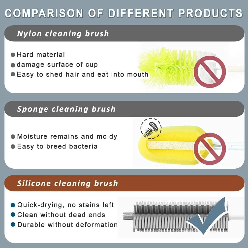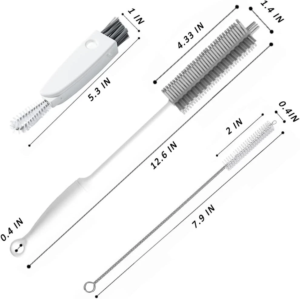 Bottle Cleaning Brush Set, Long Handle Silicone Cleaner Brushes + Gray, White Product Details Brand: leuapl Color: Gray, White Handle Material: Polypropylene Specific Uses For Product: Bottle, Water Bottle, Straw, Thermos Lid, Cup Product Dimensions: 12.59"L x 3.14"W x 1.37"H Long handle silicone brush:This cleaning brush has BPA free food grade flexible silicone bristles. Brush are tough on gunk, yet gentle enough to leave your bottle clean and scratch-free. Not a cheap thin or wire handle like other products. Firm and sturdy handle is easy to hold and use, the hook provided to hang it for drying and storage. 3-in-1 Bottle Lid cleaning Brush:This cleaning brush has 3 tool heads: ① Grey beveled brush can remove stubborn stains on the bottle lid. ② Stainless steel spiral brush can remove the stains in the creases and gaps inside the bottle lid.③ Gasket remover can help us easily remove the silicone gasket or rubber lid. Thicker and longer drinking straw cleaning brush: Length : 7.9 inches ( 20cm ); Bristle Diameters: 0.4inches; Made of Food Grade 304 Stainless Steel Wire and durable Long Nylon Bristles For Cleaning. Thoroughly Clean:Top design of the silicone brush makes it very easy to get the sides and corners.Durable bendable to reach even the most difficult of inside crevices. Adding additional bristles at the very end of the brush to get a thorough cleaning of the bottles bottom. There can repels unpleasant odors, stains, preventing nasty stains build-up which is more healthier for your family. You will no longer worry about the smelly sponge bristles, it may replace all bottle brush in your home . Multipurpose Cleaning Tools:This bottle cleaning brush set is designed to reach down into every corner of the bottles to properly clean them by cleaning residue. They can be applied to your dishes, baby bottles, Kids Food Jar, sports water bottles, stemware, vases, drinking glasses, glass mugs, tea pots, narrow neck carboys, stainless steel tumbler thermos ,wine decanter etc.