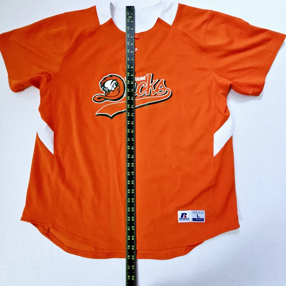 100% polyester jersey knit russell athletic dri power 1/4 button short sleeve baseball shirt. Long Island Ducks NY #26 trever bentoncourt pitcher. Shirt is in excellent clean condition no holes or tears. Sz Large Measures flat 19" across shoulders 23" pit to pit 30" Length