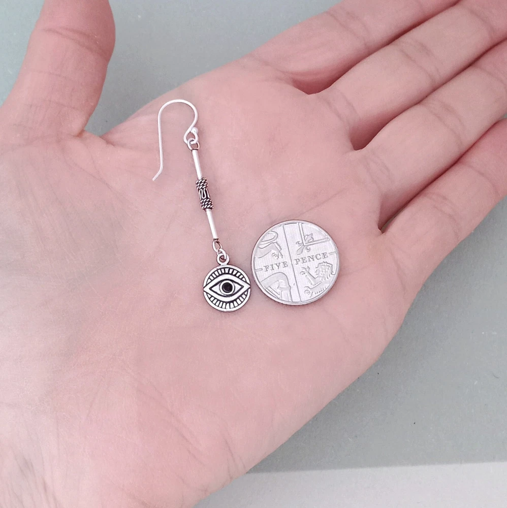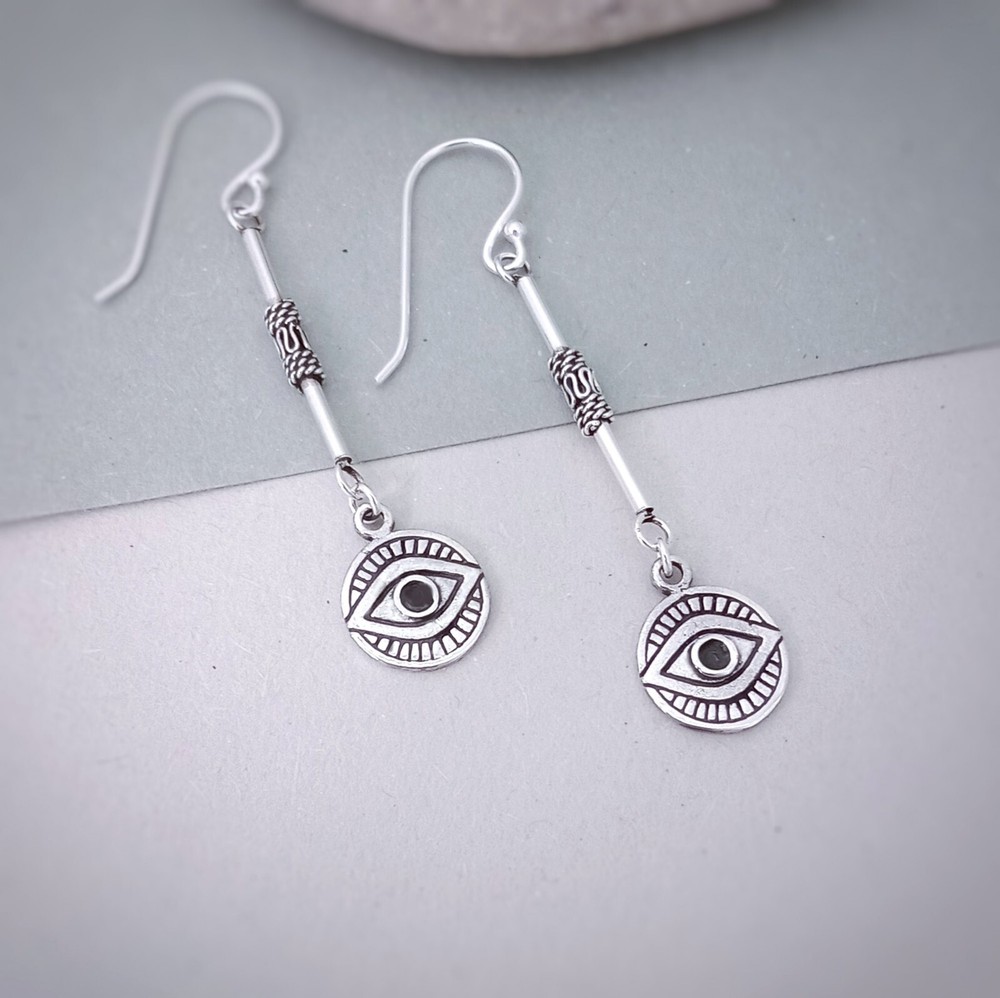 Sterling silver Evil Eye dangle earrings. Nickel Free. Cute oxidised eye symbol charm hanging from a long ornate bar, evoking ethnic patterns and a typically Boho style. A very popular symbol to ward off negative vibes and protect the wearer. Lucky Eye earring for every day wear. Meaningful jewellery gift for her. Buy Now! Dimensions: Drop length including hooks: 5 cm Diameter: 1 cm Total weight approx: 2.45 grams. Delivery Information All items dispatched from the UK. Item will be carefully packaged in eco-packaging to safeguard it during delivery and our branded cotton pouch ready as a gift. Standard Tracked 48 Shipping with Royal Mail or Yodel included FREE . Tracking number details will be sent after dispatch (which is usually within 1 working day of purchase. Weekends/festivities excluded). Faster shipping options also available for the UK. Worldwide shipping available with Royal Mail Tracked & Signed. Returns accepted within 14 days of receipt. At customers’ expense.