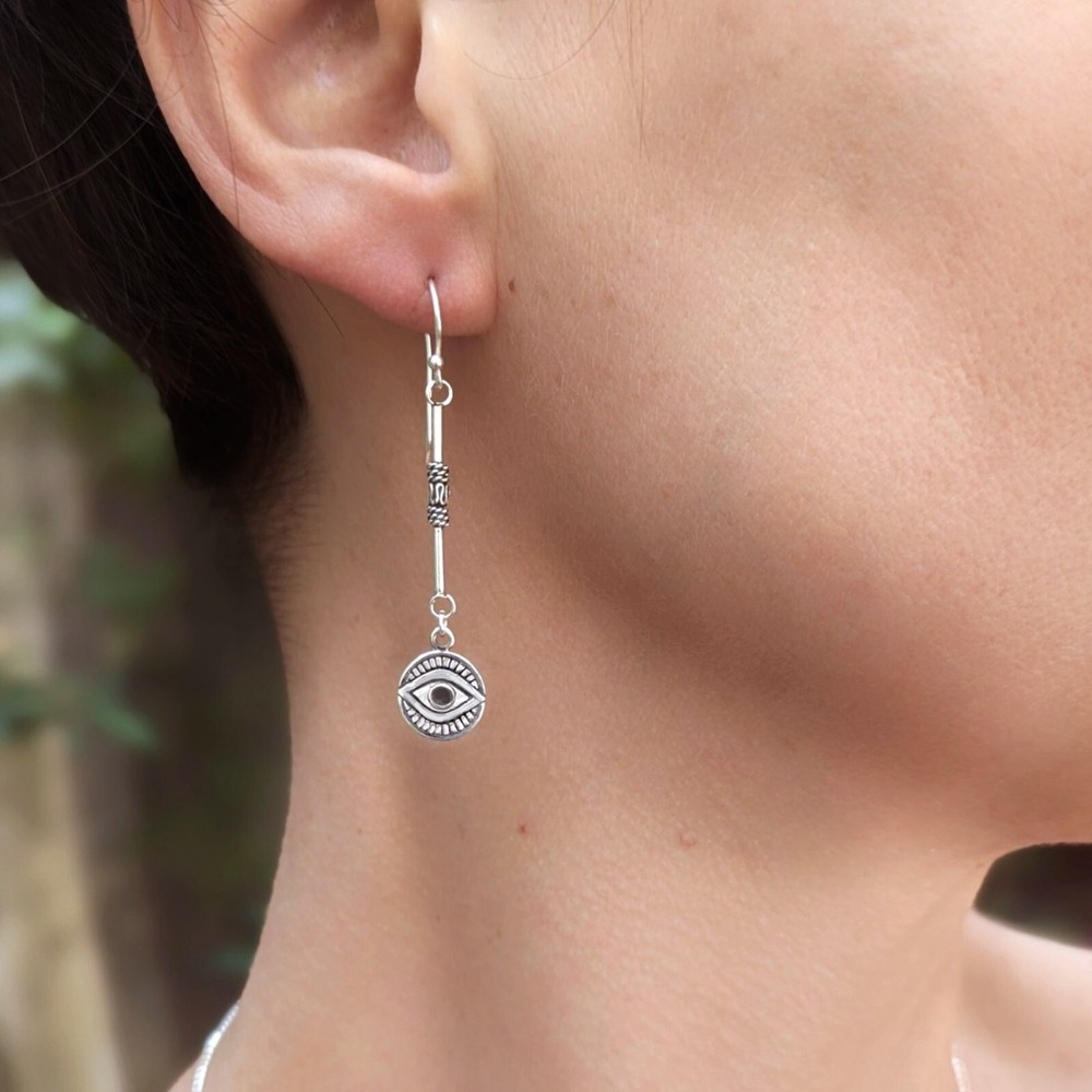 Long Lucky Eye dangle earrings in sterling silver, Evil Eye symbol Boho earrings