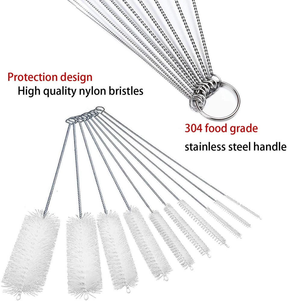 Iength:8.2”,Bristle head diameter from 1/16 to 1 inch PMade of 18-8 food grade 304 stainless steel wire Durable, strong but soft nylon bristles for cleaning Perfect tool for stainless, silicone, glass and bottle straw set of 10 brush, great gift to family and friends
