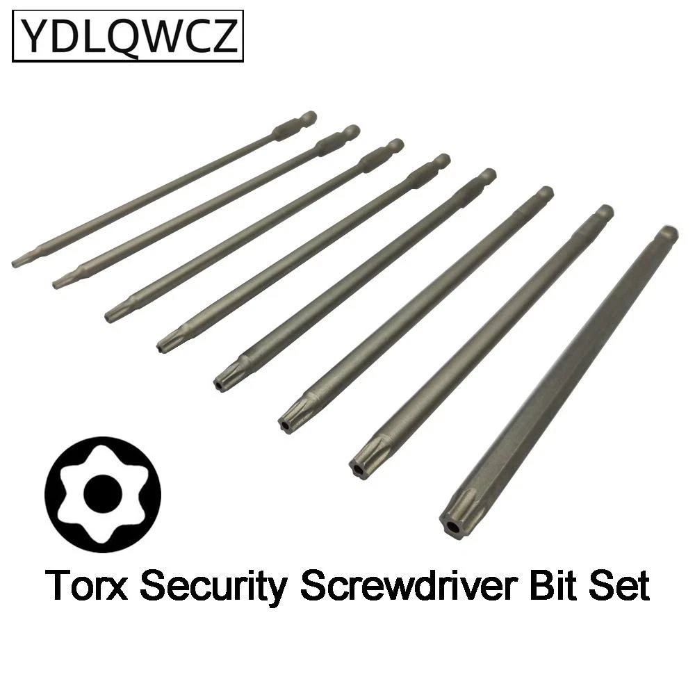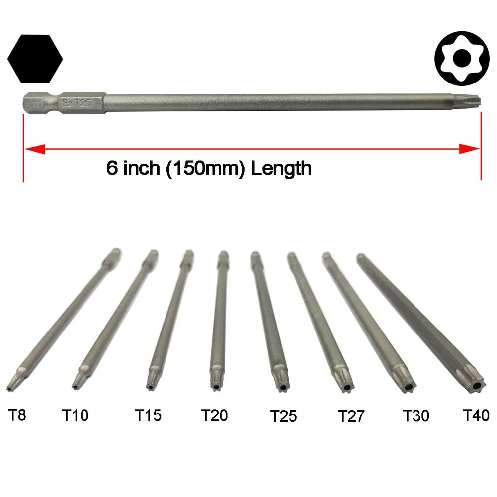 ✔【8 Size Torx Screwdriver Bits】T8, T10, T15, T20, T25, T27, T30, T40, 8 in 1 Professional Size long torx security driver bits set can meet your different needs. Size is clearly engraved on the shank for easy identification. ✔ 【Widely Application】1/4” inch hex shank, and 6 inch (150mm) length. Can be used with electric screwdriver, manual screwdriver, electric drill, group general tools, air drill and other any standard bit holders. ✔【S2 High Quality Steel】Made of S2 high quality shock-resisting tool steel, a hard and abrasion-resistant alloy metal. Torx head bits surface for steel material color,from inside to outside are the same. ✔【Magnetizable Head】Magnetizable torx security screwdriver bar(New Bits with Weak Magnetic). After Magnetized with a magnet it would with a strong magnetic, can suck the screws easily when used it. ✔【Exquisite Workmanship】This torx security tamper proof star bit set, exquisite workmanship, each edge can be accurately locked screws, no damage to the screw, and the screwdriver head.Such a practical aid in many situations.