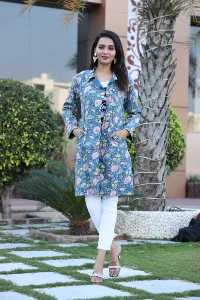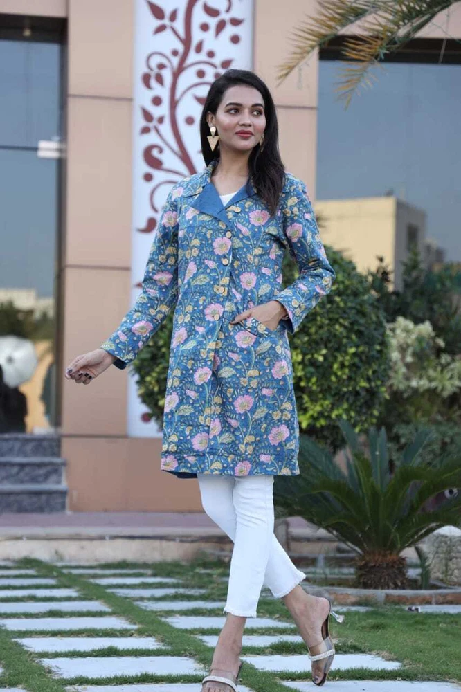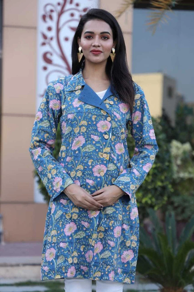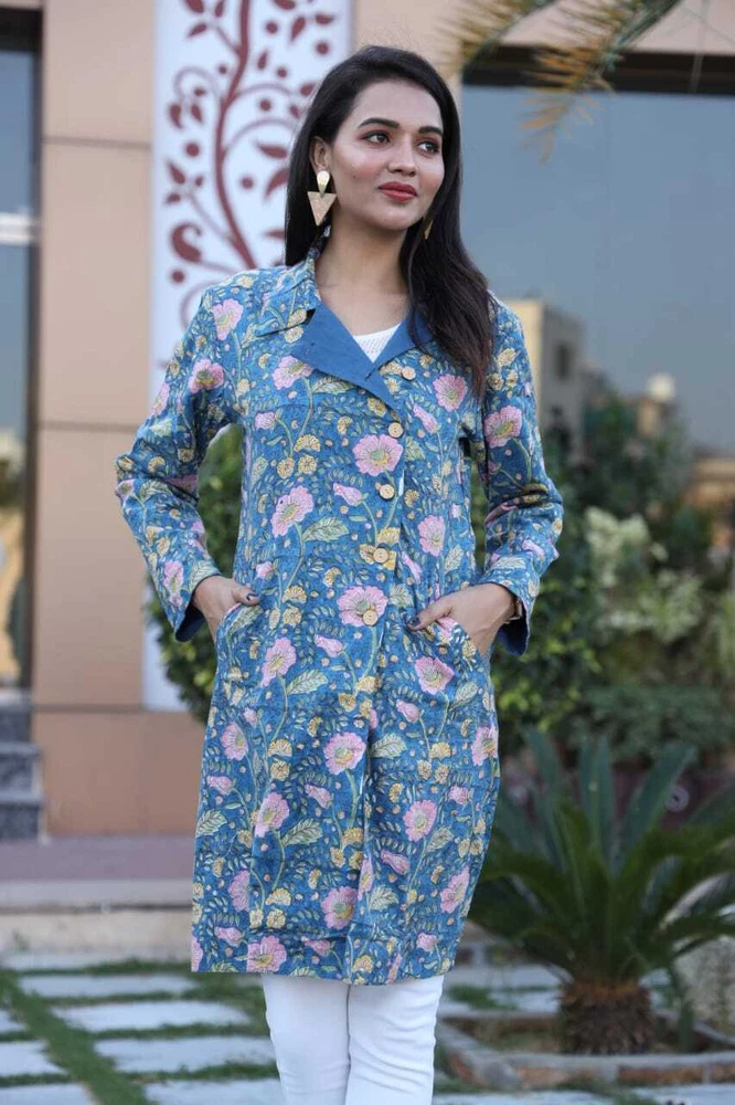 Long Winter Jackets for Women/Girls | Where Fashion Meets Comfort - 2 Layer with Two Pockets in Beautiful Colour's Elevate your winter wardrobe with this stunning handmade reversible jackets for women's & Girls. The outer shell is made of soft cotton in a beautiful blue stripe/floral pattern, while the lining is crafted from hand printed cotton, adding a unique touch to this piece. The long coat length and long sleeves of Women jackets provides warmth during the colder months, making it perfect for any occasion, from casual to formal. This quilted jacket features a button closure and pockets, and is made with 3 layers of lightweight organic cotton, providing insulation without adding unnecessary bulk. The jacket is perfect for all seasons, and its versatility is emphasized by the fact that it can be personalized, making it even more special. Made in India, this jacket is perfect for those who value art and culture, and its theme options, including festive season and hippie, make it a great addition to any wardrobe. Fabric Cotton 60×60 cambric ( Super Quality)\ Inner Side Fabric - Cotton Flex. Measurements ladies Jacket Size Bust Size ( S) - 38 Size (M) - 40 Size (L) - 42 Size (XL) - 44 Size (XXL) - 46 Note- All above Sizes of *Brust. Jacket Length- 36-37 All Sizes in *Inches.