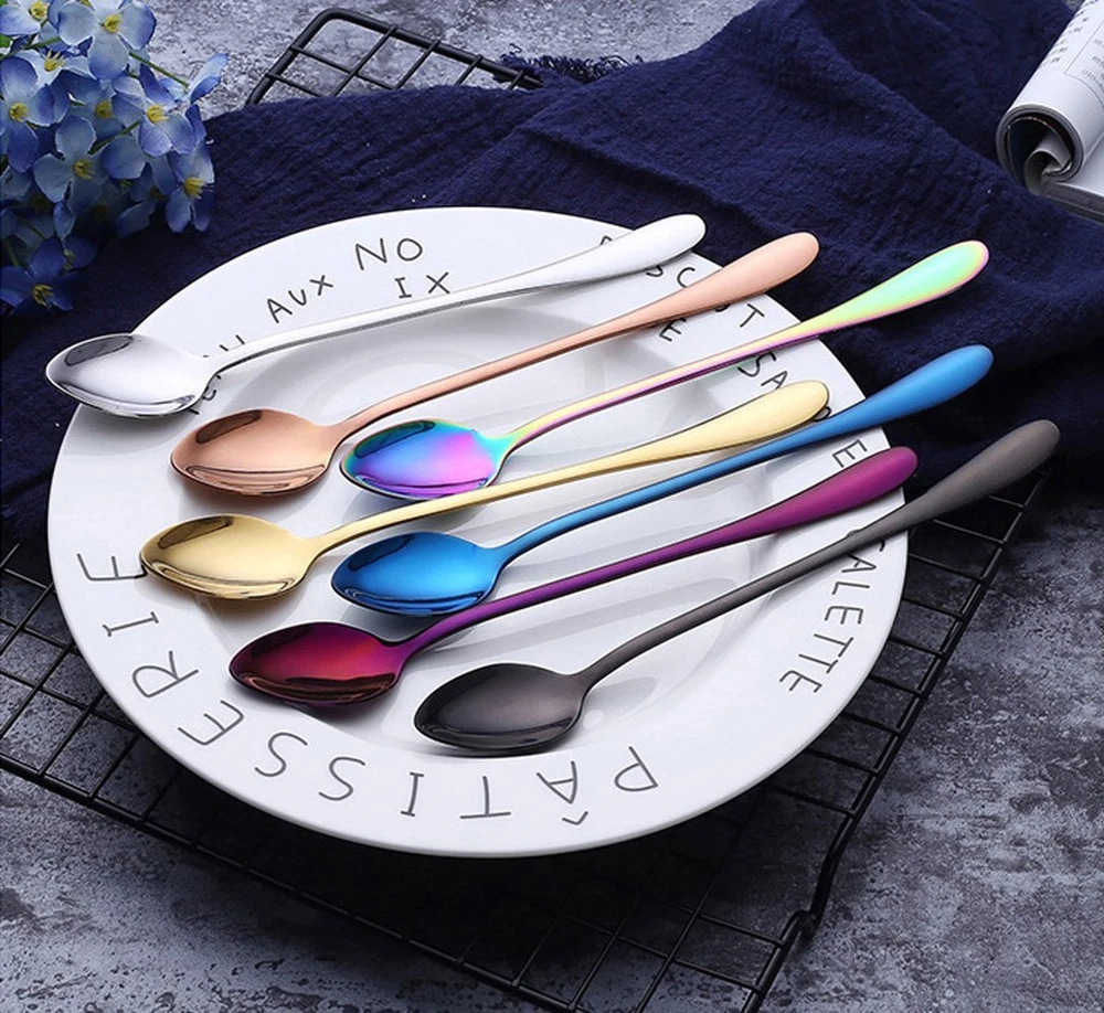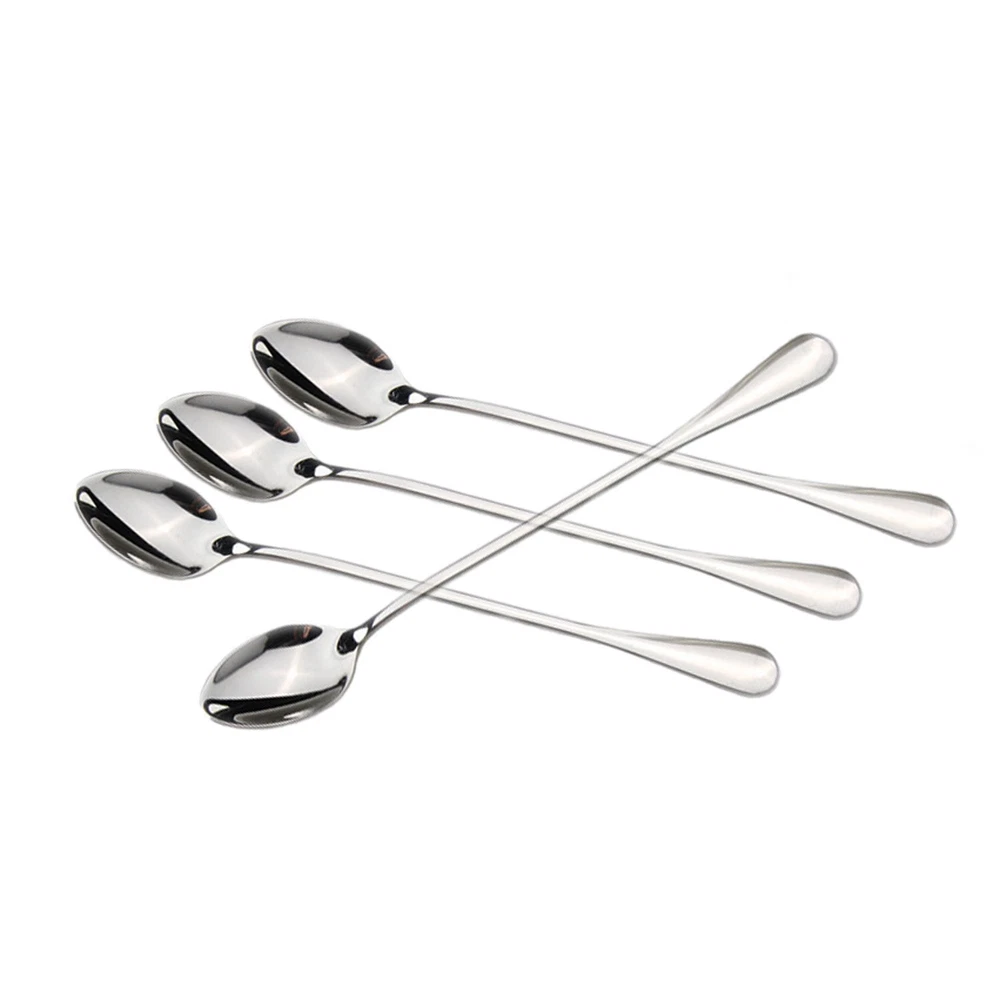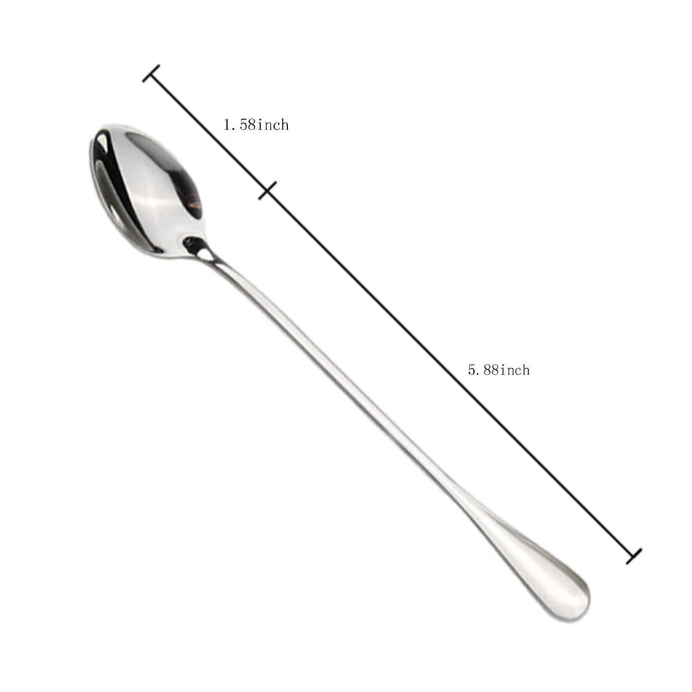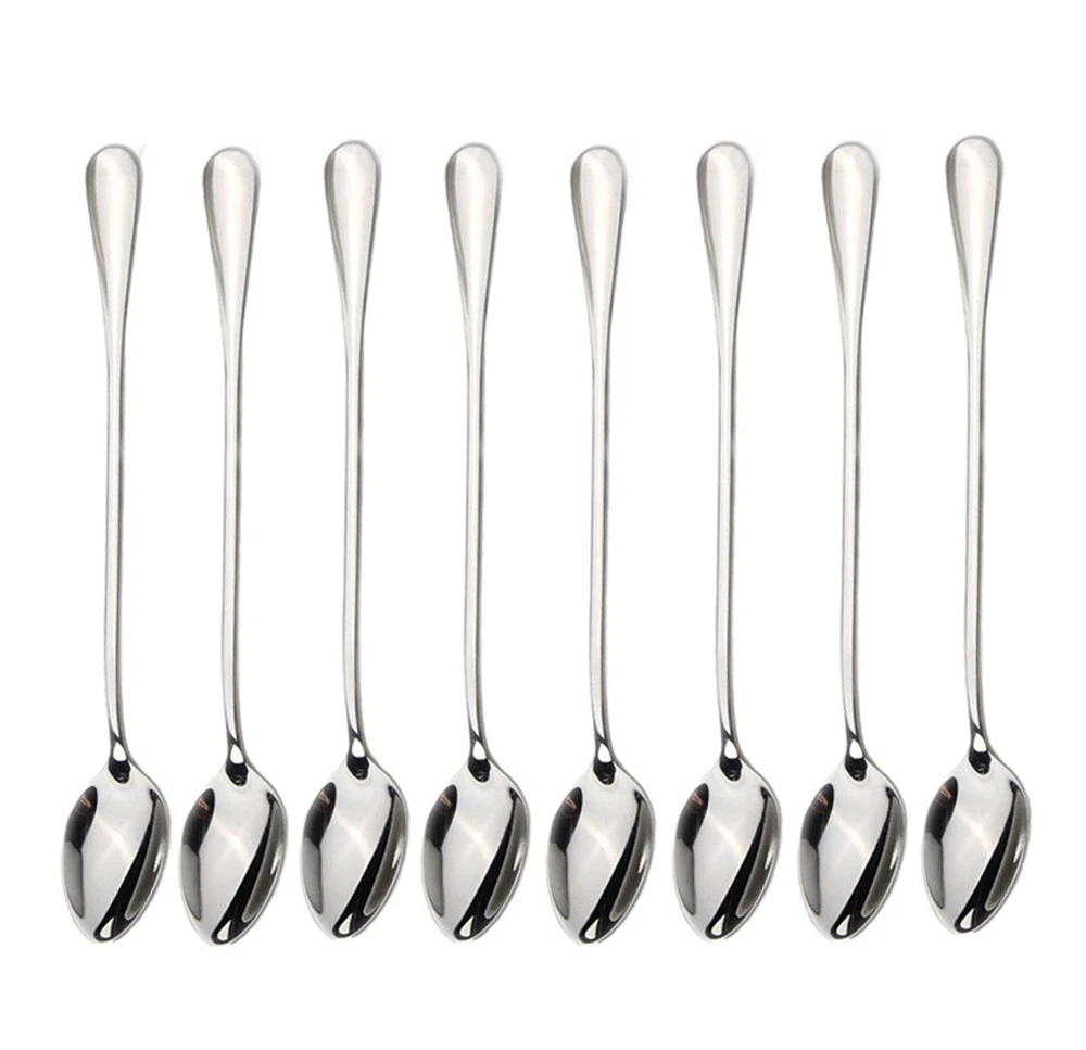 Iced tea spoons also called tall drink spoons, is a thin spoon with a very long handle. It is used primarily in the United States, for stirring sugar or other sweeteners into iced tea, which is traditionally served in a tall glass. just stirring tall glasses of cool iced tea, lemonade or chocolate milk, iced teaspoons are a perfect spoon for an ice cream sundae. Can also be use them for dishing out condiments like salsa and sour cream. Don't under estimate the ability of the iced tea spoon. Originally known as a parfait spoon, it is also commonly used for eating ice cream, especially floats and sundaes. As these desserts are usually served in tall glasses, regular teaspoons or dessert spoons become inconvenient choices due to their limited reach. This is why the spoon has a very long handle. They are durable and easy to clean so they will last through many uses. These stylish teaspoons are a fine addition to your kitchen or wet bar. Product details : Product Size: 7.5*1.2*0.15 inches Material: Stainless Steel Colour: silver Weight: 0.85 oz Quantity:8 pcs Notes: Do not leave cutlery to drain in dishwasher/sink for long time, Do not ust hard water to wash your cutlery as minerals in the water can corrode the mteal. Do not clean your stainless steel cutlery using abrasive cleaners on items like steel wool, They can leave tiny scratches over cutlery thus dulling the shine. Always use a mild detergent to clean your stainless steel culery. Avoid stainless steel cutlery to come in direct contact with aluminum as it releases chlorine which can lead to discoloration of stainless steel.Dry immediately after washing. Use a soft cloth to do so. 8-piece ice cream spoons/ice teaspoons, coffee mixing spoon Made of high quality stainless steel vacuum titanium, never change color Dishwasher-safe without harsh detergents Perfect for home, office and restaurant. Food quality materials for human,nice for family dinner party.