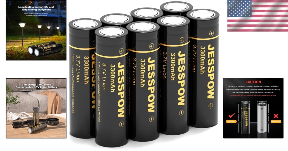 Long-Lasting 3.7V Li-ion Flat Top Batteries for Flashlights & RC Cars – 8 Pack ‹ › ‹ › ‹ › ‹ › ‹ › ‹ › ‹ › ‹ › ‹ › ‹ › ‹ › Long-Lasting 3.7V Li-ion Flat Top Batteries - 8 Pack Experience the power of reliability with our premium rechargeable 3.7V Li-ion Flat Top Batteries. Specially designed for high-demand devices, each battery boasts a remarkable capacity of 3300mAh, ensuring your devices stay powered longer and perform flawlessly. Key Features: Extended Battery Life: Engineered with premium Li-ion cells for longevity, our batteries can be charged or discharged at any time without harm, providing an unmatched lifespan for all your power needs. Wide Compatibility: Perfectly compatible with a range of high-power devices including headlamps, flashlights, cameras, radios, doorbells, LED lights, solar lights, toys, small fans, RC cars, and headlights. Notable Size: With dimensions of 18mm x 65mm, these flat top rechargeable batteries are perfectly suited for devices that require a compact power source. Please verify compatibility before purchase. Long-Lasting Power: Utilizing advanced energy aggregation technology, these batteries outperform with a fivefold increase in longevity for high-drain applications, ensuring you’re never left in the dark. Why Choose Our Batteries? Imagine accessing reliable power whenever you need it. Our Long-Lasting 3.7V Li-ion Flat Top Batteries provide that peace of mind, effortlessly powering your essential devices for countless uses. Whether you’re braving the outdoors, capturing precious moments on camera, or simply illuminating your home, these batteries will exceed your expectations with their dependable performance and extended life. Exceptional Service: Should you have any inquiries or require assistance, our dedicated customer service team is at your service. We are committed to providing you with swift and satisfactory support. Elevate your power experience today—choose our Long-Lasting 3.7V Li-ion Flat Top Batteries and ensure a reliable energy source wherever you go! Shipping Free & Fast Shipping - We offer free shipping to most of the USA with a normal delivery time of 3-7 days. However, due to the current situation, additional delivery time (up to 3 weeks) may be required for some items. Alternative Carriers - We may use alternative carriers (e.g. USPS, FedEx, UPS, etc.) to ensure your package arrives safely and on time. Due to the use of multiple carriers, we are unable to provide a tracking number automatically. Handling Time - Orders are processed and shipped within 1-2 business days of receiving cleared payment. Shipping Restrictions - Shipping to Alaska, Hawaii, Puerto Rico, Guam, and other US territories may incur shipping charges or delivery restrictions. Please contact us before ordering, or your order can be refunded/cancelled. State Restrictions - There may be restrictions based on your state of purchase. For example, certain items may not be shipped to California due to state regulations. Contact for Tracking Updates - If you require tracking updates or have any concerns about the delivery of your order, please feel free to contact us, and we will be happy to assist you. Return Please see our eBay Return Policy. Thank you. Payment We accept all major credit cards, PayPal, and Apple Pay for your convenience. Your payment information is secure and encrypted to ensure a safe and seamless transaction. Please complete your payment within 3 days of purchase to avoid any delays in shipping. Feedback Your feedback is extremely important to us. We strive to provide the best products and customer service possible. If you are satisfied with your purchase, please take a moment to leave us a positive review. If you have any concerns or issues with your order, please contact us before leaving negative feedback. We are committed to resolving any problems and ensuring your satisfaction. Contact Us If you have any questions or concerns, please feel free to reach out to our customer support team. You can contact us through the eBay messaging system. We are available Monday to Friday, 9:00 am to 5:00 pm EST, and we will do our best to respond to your inquiry within 24 hours. Thank you for supporting our small family business! UPC: Not Set Unit Quantity: 8 Expiration Date: Rechargeable Lithium Batteries Application: High Drain Devices,Low Drain Devices,Solar/Wind Devices Brand: Unbranded Type: Li-Ion Chemical Composition: Li-Ion Amp Hours: 3.3 Ah Voltage: 3.7 V Battery Size: Not Set MPN: Not Set Unit Type: oz Country/Region of Manufacture: Not Set Manufacturer Warranty: Not Set