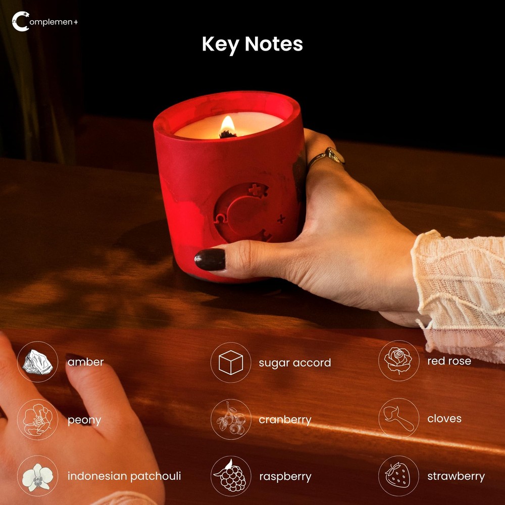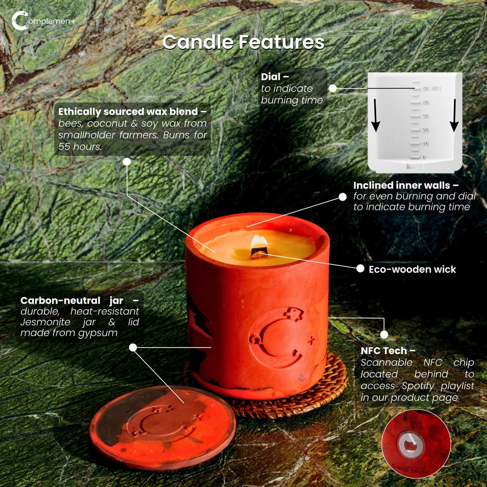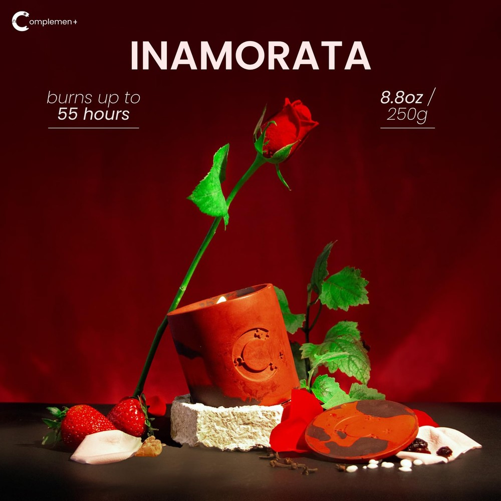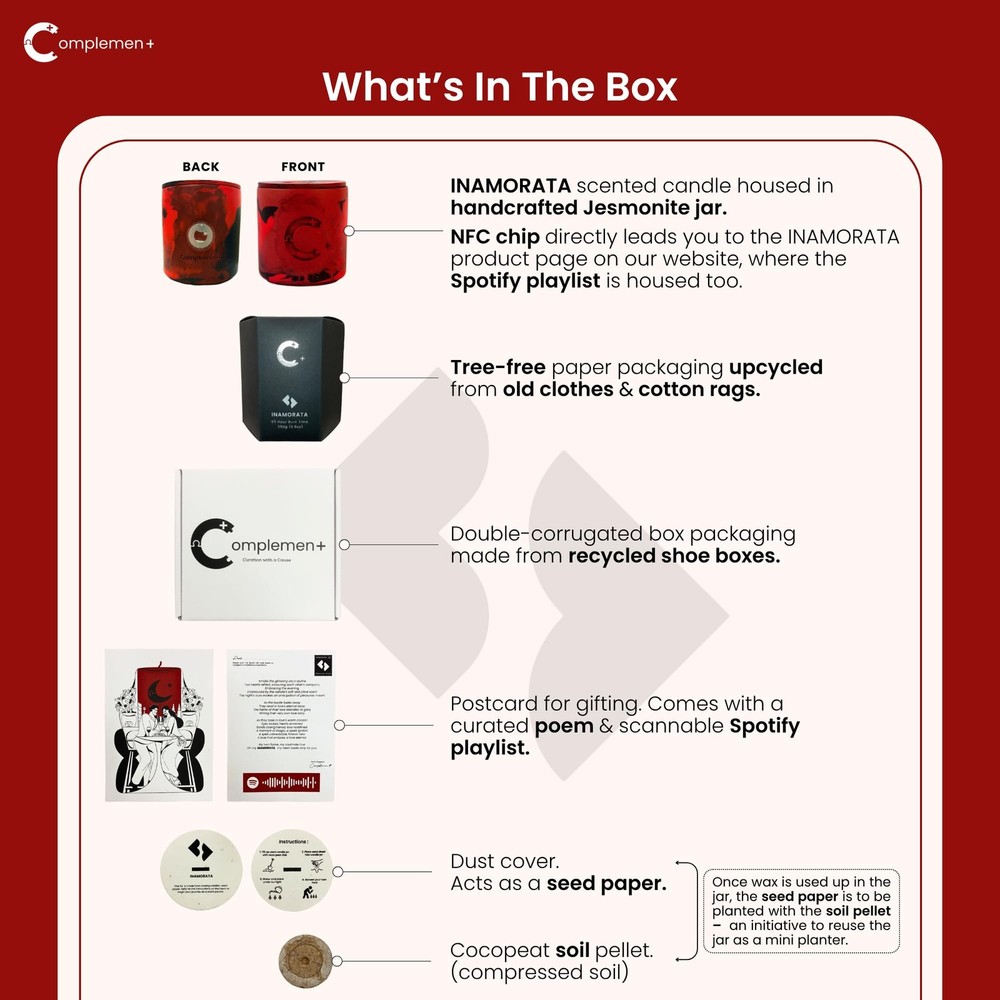 Sweet as the taste of falling in love for the first time, Inamorata ignites the heart and keeps that first spark of love burning with initial sugary accents and fruity accords of cranberry, raspberry and strawberry. Warm up the night with spicy notes of cloves, take things up a notch with floral peony and Indonesian patchouli, before finally sealing things with passion - and perhaps a kiss - through a hint of soft tender amber and rose. Roses may be red, And amber may be the colour of love misconstrued, But let Inamorata set the mood, For true love to come true.. --- Fragrance Notes: - Indonesian Patchouli - Red Rose - Amber - Peony - Cranberry - Raspberry - Strawberry - Sugar Accord - Clove - Red Rose --- Candle Details: - Housed in an artisanally crafted, repurposable Jesmonite jar, polished to perfection. - Weighs 250g. - 55-60 hours in burn time from a clean wax blend of sustainably sourced soy, coconut and beeswax. - FSC certified wooden wick that gently crackles when burnt. - IFRA (International Fragrance Association) certified fragrance oils that are synthetic fragrance-free, phthalate-free and paraben-free. - Protected by biodegradable, tree-free paper packaging upcycled from old clothes, that helps save litres of water and preserve countless forests. - Thank You card equipped with a personalised poem tailored to the rhythm of each Spotify Playlist. - Seedpaper dust cover and soil pellets provided together to repurpose your used jars into plant pots. --- Candle Care: 1. Trim 1/4 of the wick after each burn 2. Light for 2 to 4 hours 3. When not in use, cover your candle with the lid 4. Refrain from burning your candle unattended 5. For safety, keep away from children and pets Housed in an artisanally handcrafted candle jar made from eco-friendly, Jesmonite by marginalised women. Premium, Sustainably-sourced Fragrances: Ignite your senses with the Inamorata candle, a harmonious blend of fruity cranberry, strawberry, raspberry soft rose petals & warm amber and cloves. Perfect as a Valentine's gift for your other half, or a serene evening of self-care. IFRA (International Fragrance Association) certified fragrance oils that are synthetic fragrance-free, phthalate-free and paraben-free formulated by a World Renowned Luxury Perfumer. Clean, organic blend of soy, coconut and beeswax sourced from smallholder farmers. Burn Time: 55-60 hours of long-lasting aroma during your romantic evenings, creating a cozy and sensual ambiance. Wick Type: FSC-certified Eco wooden wick that gently crackles when burnt. Tech-enabled: Each candle comes with a tappable NFC chip enables easy access to Inamorata's product page and an immersive Spotify playlist matched to Inamorata's candle scent. Perfect as your next Valentine's gift to your other half, a lovely anniversary gift or a treat for yourself to indulge and experience the ultimate relaxation with our aromatherapy candle. Protected by biodegradable, tree-free paper packaging upcycled from old clothes, that helps save litres of water and preserve countless forests. Thank You card equipped with a personalised poem tailored to the rhythm of each Spotify Playlist.
