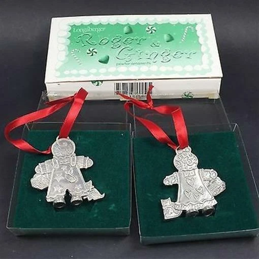 Longaberger 2000 Christmas Roger & Ginger(bread) Pewter Tree Ornament Set #73369 BRAND NEW Longaberger Christmas 2000 Set of Two Pewter Roger and & Ginger Gingerbread men Ornaments, which includes the Roger and Ginger Gingerbread people in their own storybook gift box. Longaberger ornaments are the best, very detailed and so cute! Perfect GIFT IDEA for that special Longaberger Collector!! This item is MINT, NEVER USED in the ORIGINAL packaging and has been stored in a closet in my CLEAN, TOTALLY NON-SMOKING home. We gladly combine shipping for multiple items. Powered by SixBit's eCommerce Solution