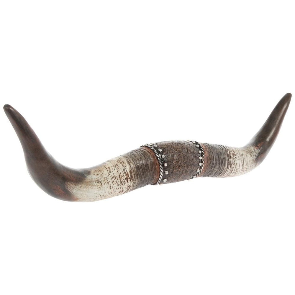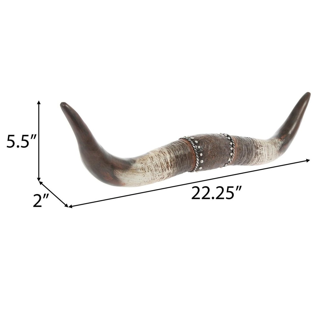 Bring the rugged spirit of the Wild West into your home with this striking Longhorn Western Wall Decor. Crafted from durable resin material, this eye-catching piece features horns connected at the center by a section that mimics an ornate leather strap, adorned with an intricate floral design. Measuring 22.25 inches wide, 5.5 inches tall, and 2 inches deep (56.5 cm x 13.97 cm x 5.08 cm), this statement piece is designed to be mounted on the wall using the included 2 keyhole slots. Whether you hang it in your living room, bedroom, dining room, kitchen, bathroom, or even outdoors, this affordable wall decor will add a touch of rustic charm and cowboy flair to your space. With its bold design and affordable price, this Longhorn Western Wall Decor is a must-have for anyone looking to embrace the spirit of the American West. Decorative Accent: Resin longhorn wall decor with ornate floral design in the center, perfect statement piece. Dimensions: 22.25 inches (56.5 cm) wide, 5.5 inches (13.97 cm) tall, 2 inches (5.08 cm) deep. Mounting: Includes 2 keyhole slots for easy hanging on walls. Versatile Style: Western-inspired design suitable for living rooms, bedrooms, dining areas, kitchens, bathrooms, or outdoor spaces. Affordable Decor: Budget-friendly wall art that adds a touch of rustic charm. Color: Brown, White, Gray & Silver