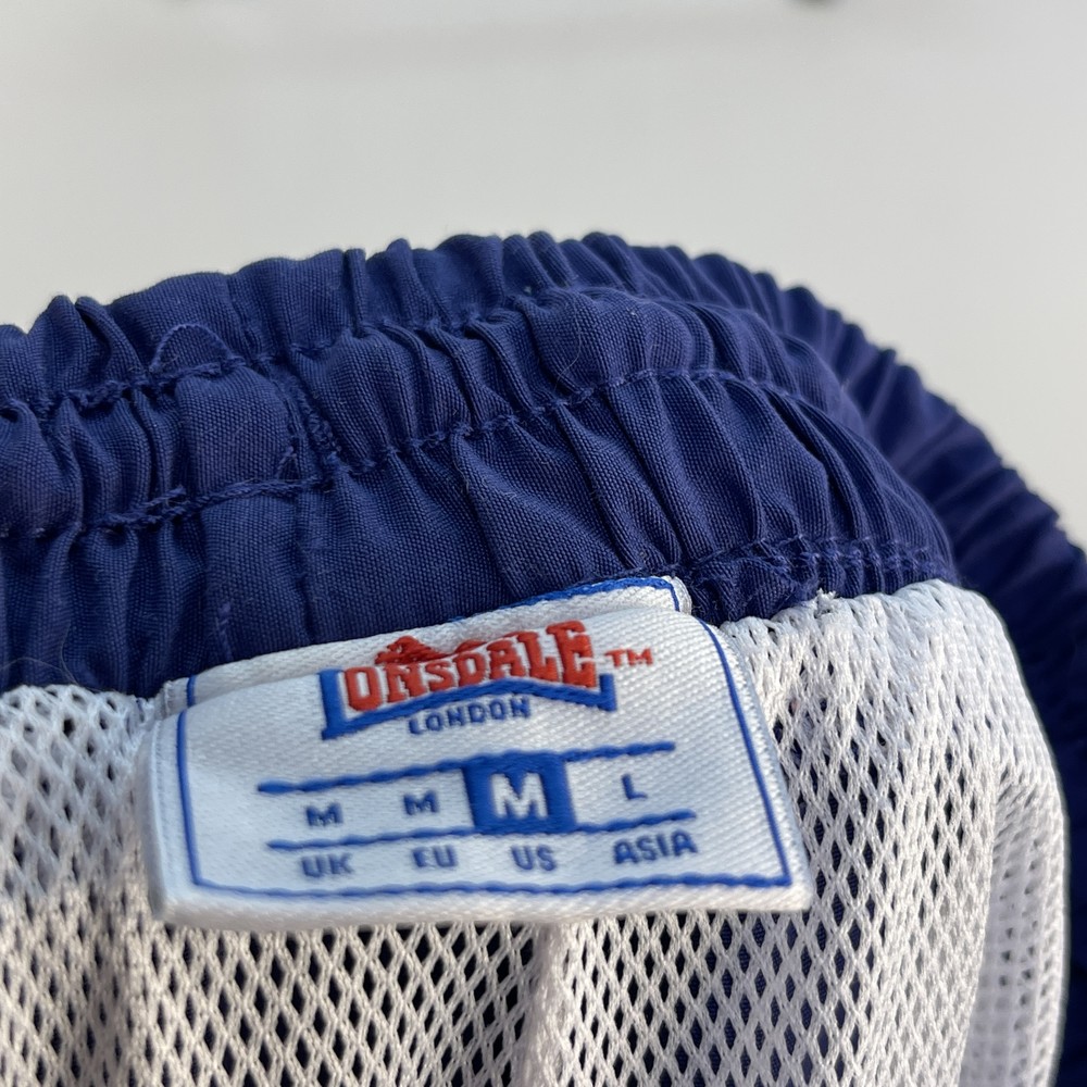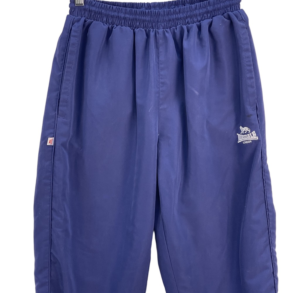 Lonsdale London blue jogger track pants with zippered ankles and elastic waist band. Condition: Good condition with no noticeable flaws Size: UK Medium, EU Medium, US Medium, Asia Large Features: Blue, Lonsdale logo, Elastic cuffs, Side pockets, Elastic waist, Zippered ankles Measurements: Waist: Approx. 32 inches Inseam: Approx. 28 inches Brand: Lonsdale Type: Track Pants Style: Elastic Waist Color: Blue Material: 100% Polyester Keywords: Jogger, Track, Unisex, Lonsdale, Blue, Elastic, Medium, Fashion