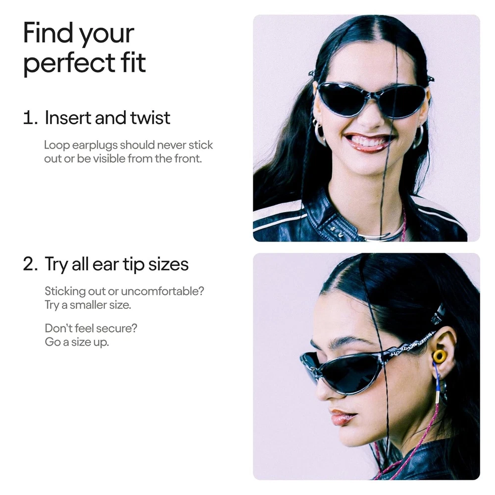 Loop Experience 2 Ear Plugs – Stylish Certified Hearing Protection for Concerts & Festivals, Live Events, Musicians, Sports, DJs and Nightlife – 17dB Noise Reduction Earplugs (High-Fidelity) About this item LESS NOISE, CRISPER SOUND – Enjoy the moment at your volume with Experience 2 earplugs. Designed with live events in mind, Experience 2 earplugs lower the volume without compromising sound quality, ensuring a crisp, clear listening experience at concerts, festivals, sporting events and beyond. CERTIFIED HEARING PROTECTION – Loop Experience 2 earplugs qualify as certified hearing protection, keeping your ears safe from damaging noise for peace of mind in loud situations. Experience 2 offers 17 dB (SNR) of filtered noise reduction. MADE FOR DANCING AND MOVING – Designed to stay put day and night, Experience 2 earplugs are the perfect event companion. Customize your fit with 4 upgraded ear tip sizes for a secure fit, even in smaller ears. Loop earplugs are reusable, easy to clean and built to last. EASY TO USE – Experience 2 earplugs are easy to insert and come with adjustable ear tip sizes for optimal noise reduction and a comfortable fit throughout the day. Just pop them in, twist to secure and head out at your volume. When inserted correctly, Experience 2 earplugs shouldn't stick out from the front. IN THE BOX – 1 set of Loop Experience 2 earplugs, 4 sets of silicone ear tips (sizes XS + S + M + L), 1 portable and convenient keychain Carry Case. Important information Safety Information: Choking Hazard Warning: Please note, this product contains small parts and may present a choking hazard for children under 3 years of age. Keep out of reach of young children. Directions: For detailed instructions on how to use the earplugs, please scan the QR code included in the packaging. The code will provide step-by-step guidance to ensure proper fit and optimal protection. Product Description