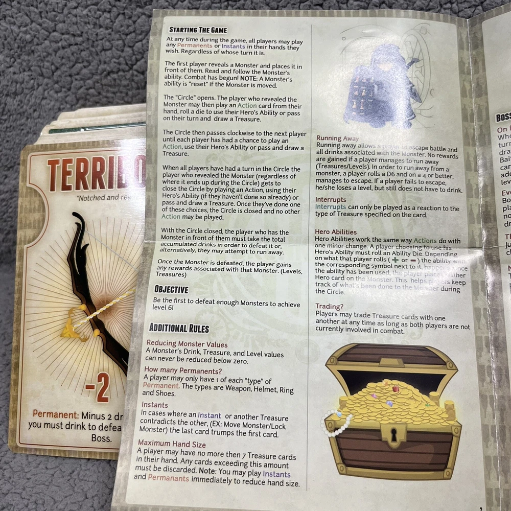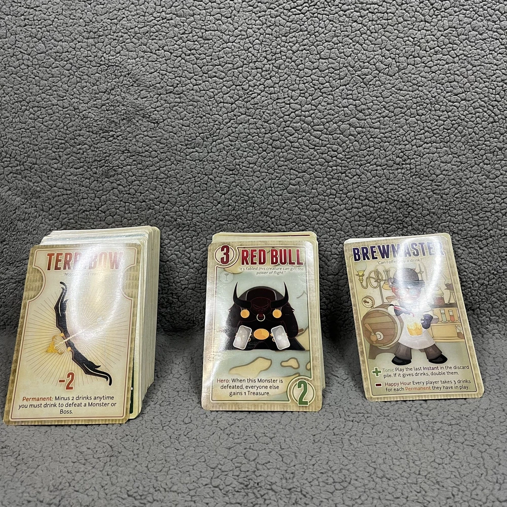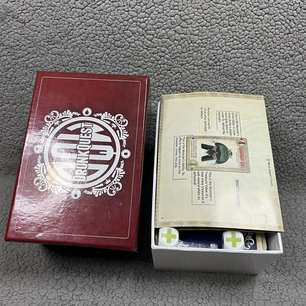 The "Drunk Quest Drunkquest" game by Loot Corps is a boxed party game designed for a minimum of 3 players, recommended for adults 21 years and older. Released in 2013, this fantasy role-playing game combines elements of a traditional board game with card and RPG mechanics. The game is geared towards both boys and girls, offering a fun and unique experience for those looking for a light-hearted and humorous gaming session. The complete set is described as rare, making it a desirable addition to any game collection. It contains 118 green cards 66 red cards and 16 blue cards. Please see attached pictures and contact me with any questions thank you 😊