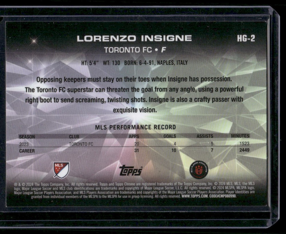 The product is a 2024 Topps Chrome MLS trading card featuring Lorenzo Insigne from Toronto FC. This card is a rare Hidden Gems Case Hit SSP, indicating it is a special insert within the set. The card is not autographed and is not graded based on the original listing. It is part of the Major League Soccer (MLS) series manufactured by Topps for the 2024 season, specifically card number HG2. This collectible item appeals to soccer fans and trading card enthusiasts looking to add a unique piece to their collection.