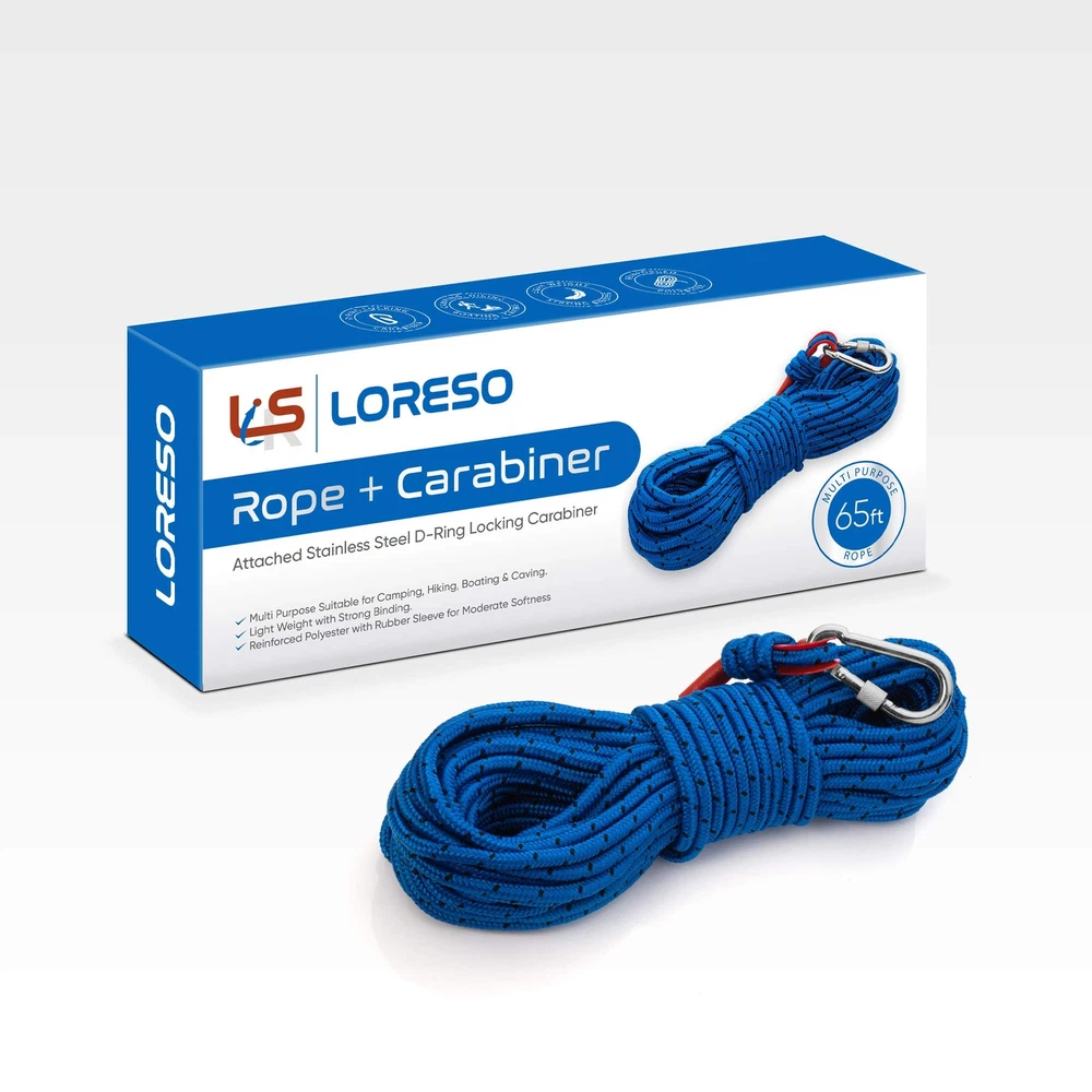 Here’s How You Can Complete Your Magnet Fishing Kit With The Ultimate Rope! Looking for an easy-to-carry and durable magnet fishing rope with a carabiner? Want to have a single polyester rope for your camping, hiking, boating or caving adventures? Introducing The Loreso Heavy Duty 65ft Magnet Fishing Rope For Serious Magnet Fishers! Now you don’t have to settle for cheaply-made 500 pound magnet fishing ropes that will break while you are trying to snag a heavy object. The Loreso magnet fishing kit rope is here to make sure you never miss that lucky find because of your low-quality ropes. Top 3 Reasons To Replace Your Existing Rope With The Loreso Ultra-Strong Magnet Fishing Rope: More Bang & Strength For Your Buck: who said that strong and reliable fishing ropes have to cost a small fortune? We are here to offer you a robust yet affordable alternative that features a Max tensile force of 1200 pounds and has a whopping 600kg weight limit. Rope For All Your Outdoor Applications: whether you want to secure your camping tent, set up your tree hammock, or install a tree swing for your , our tear-resistant, reinforced polyester rope for magnet fishing will cover your needs. Well-Made Rope Will Last For Years To Come: while other ropes fall apart after a few days on the boat, our high-quality magnet fishing braided rope is resistant to chemicals, UV rays and water for maximum durability. Need More Reasons? Steel D-Ring Locking Carabiner 1/3-Inch Diameter / 65ft Length Lightweight & Space-Saving With Strong Binding Ability Rubber Sleeve With Moderate Softness 100% Satisfaction *Not Recommended For Rock Climbing – Please Check Breaking Strength & Keep Safety In Mind What Are You Waiting For? Click “Add To Cart” NOW While Supplies Last! Take All The Fuss Out Of Magnet Fishing with the Loreso heavy duty rope, which comes with a strong carabiner hook and is made from reinforced polyester for unmatched performance. Take your magnet fishing game to the next level with our rope. Snag Objects Over 1000LBS Without Any Worries with our robust and reliable magnet fishing rope, which has a Max tensile force of 1200 pounds and a 600kg weight limit. Ideal for serious magnet fishers, our polyester rope will get the job done. 65 Feet Of Camping Rope, 100+1 Different Uses: This multipurpose magnet fishing rope with carabiner will make your upcoming camping, hiking, boating or caving adventure easier and safer. Plus, you can use it for tree swings or hauling loads. Heavy-Duty Design - Made To Handle Wear & Tear: Unlike all those cheaply-made nylon ropes or 500lb ropes, our 1/3 inch hiking rope is lightweight and compact and also tear resistant, so you can use it anywhere with confidence. How To Make The Most Of Your Fishing Rope: Our moderate softness rubber sleeve will protect your hands from damage, but we always recommend using protective gloves. DO NOT USE the Loreso rope as a rock climbing rope or rappelling rope.