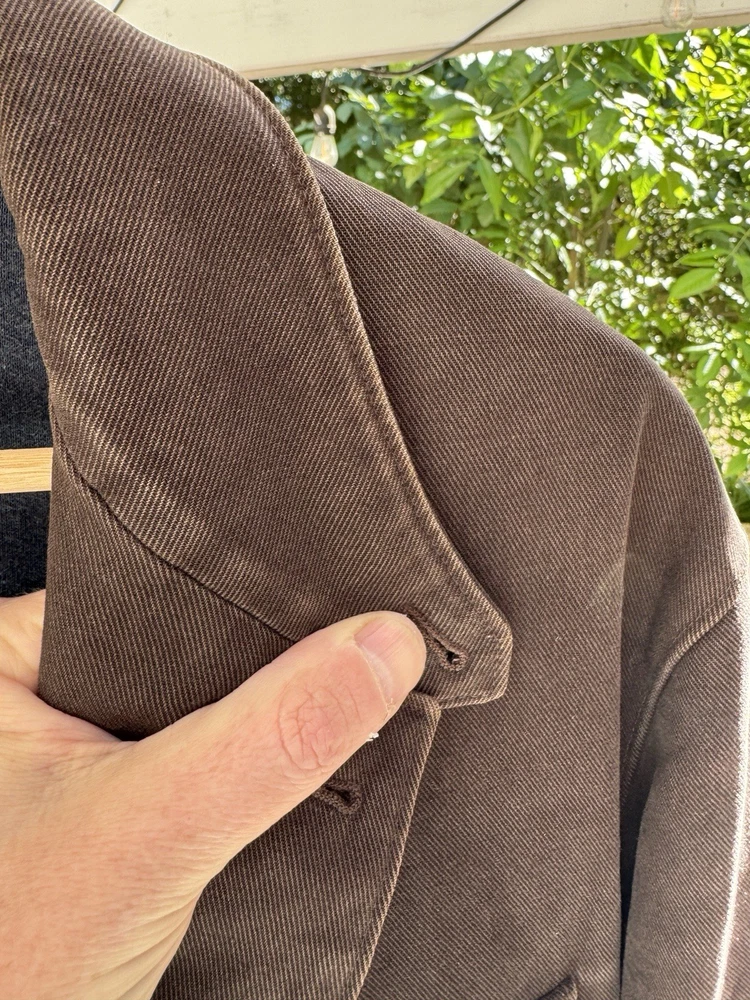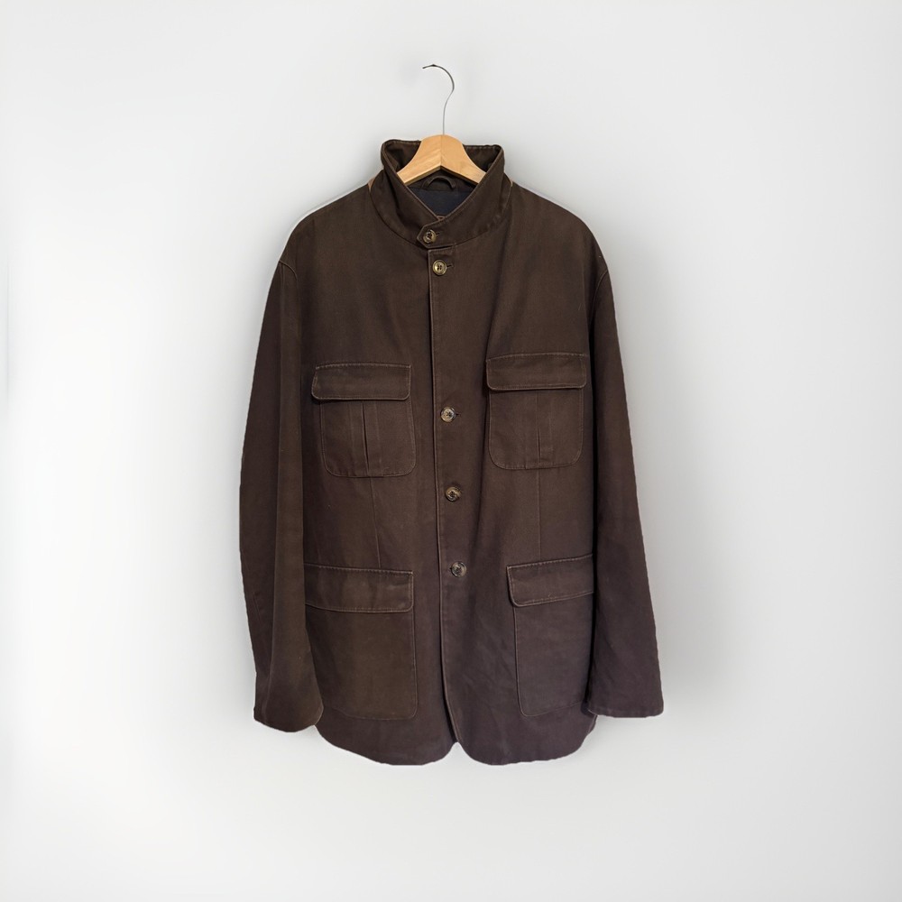 An incredible example of Italian "Quiet Luxury." This field jacket features Loro Piana’s patented Storm System technology, making the premium cotton shell wind and water-resistant while remaining breathable. This piece is loaded with high-end details, including genuine suede trim under the collar and lining the pockets, and beautiful engraved horn buttons. The interior is a soft, comfortable cotton, making it the perfect multi-season layer. Condition: Excellent pre-owned condition with a beautiful natural patina to the cotton. No major flaws, stains, or tears. All original hardware is present and functional. Approximate Measurements (Flat Lay): • Pit to Pit: 26 inches • Length: 29 inches • Shoulder to Shoulder: 20 inches • Sleeve Length: 25 inches Shipping: Fast, insured shipping. Please reach out with any questions!