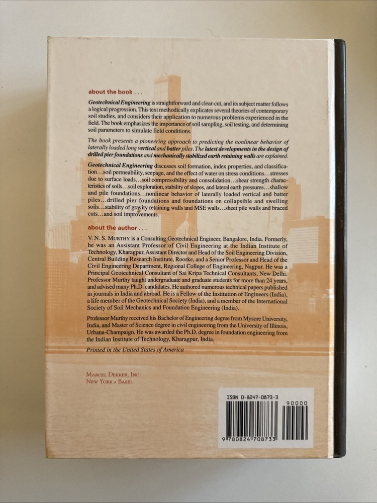Type:TextbookItem Weight:71.4 OzSeries:Civil and Environmental Engineering Ser.Item Width:7.2 inAuthor:V. N. S. MurthyPublication Name:Geotechnical Engineering Vol. 10 : Principles and Practices of Soil Mechanics and Foundation EngineeringNumber of Pages:1056 PagesSubject:Civil / Soil & Rock, Construction / General, Civil / GeneralISBN:9780824708733Publisher:CRC Press LLCFormat:HardcoverItem Height:2.1 inLanguage:EnglishPublication Year:2002Country of Origin:United Statesgtin13:9780824708733Subject Area:Technology & EngineeringItem Length:10.2 in