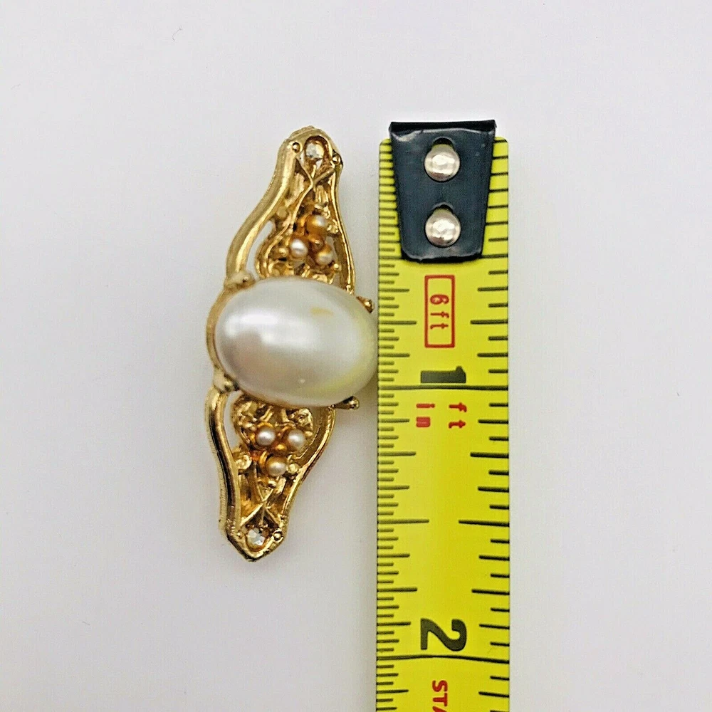 Type: Brooch Handmade: No Metal Purity: Unknown Item Length: 2.5 Base Metal: Gold Main Stone Creation: Unknown Main Stone Color: CLEAR Jewelry Department: Fashion Era: Undated Seller Notes: “Good Used Condition” Country of Origin: Unknown Material: Mixed Materials Country/Region of Manufacture: Unknown UPC: Does not apply Color: Gold Brand: Unbranded gtin13: Does not apply Main Stone: Rhinestone & Faux Pearl Metal: Mixed Metals Department: Women Seller Warranty: No Certification: NA Antique: No Main Stone Shape: Round Signed: No Vintage: Yes Main Stone Treatment: Unknown Theme: Retro Customized: No
