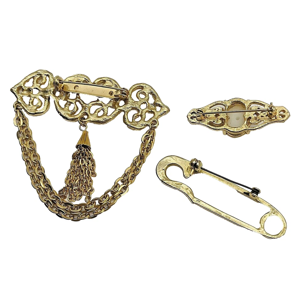 Lot 3 VTG Retro Victorian Look Brooch Pin Gold Tone Tassel Gems