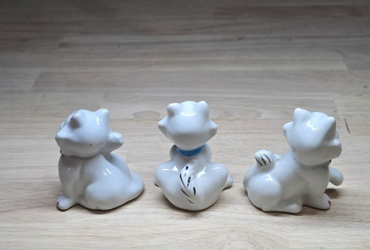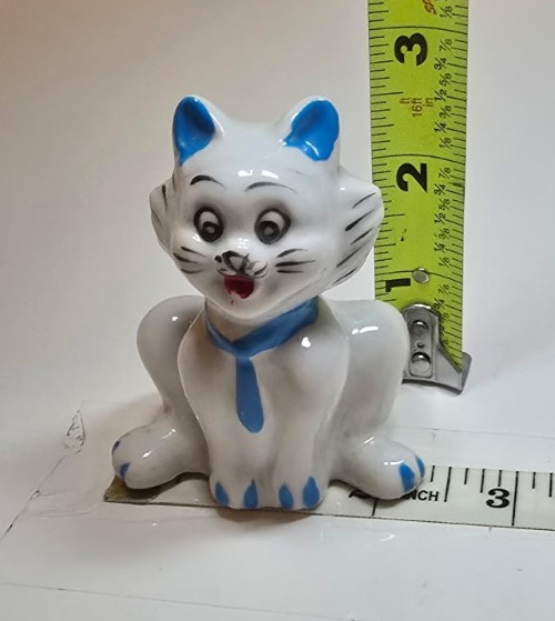 Adorable set of three vintage ceramic kitten figurines — a charming mid-century trio that any cat lover or figurine collector would enjoy! Each kitten is approximately 2 inches tall and features a glossy white glaze with hand-painted details including expressive cartoon-style faces with big eyes, red lips/noses, and painted whiskers. Each kitten strikes a different playful pose — one seated and winking, one sitting upright with a blue bow tie and blue-tipped paws, and one in a stretching/reclining pose. Two kittens have red accents (bow/collar, paw tips) and one has blue accents, giving the set a cute, coordinated look. Style is consistent with mid-century Japanese export porcelain figurines from the 1950s–1960s. Unsigned/unmarked on the base. Details: Quantity: Set of 3 Size: Approx. 2" tall each Material: Glazed ceramic/porcelain Colors: White with red and blue hand-painted accents Markings: Unsigned Era: Circa 1950s–1960s Style: MCM, kitsch, whimsical A sweet display piece for a shelf, curio cabinet, or cat-themed collection!