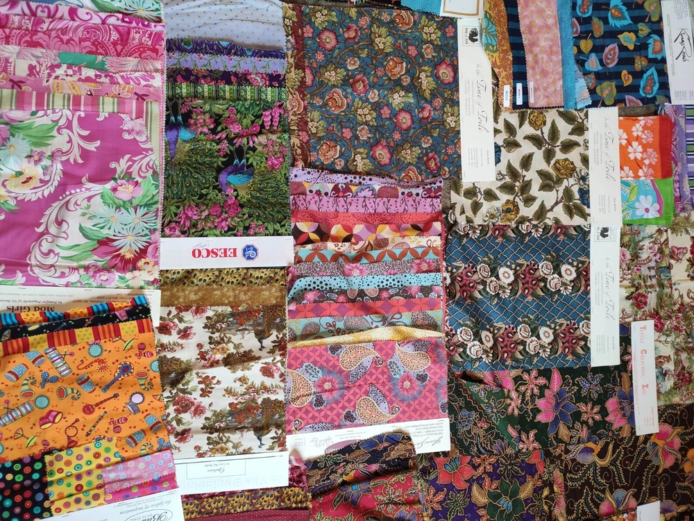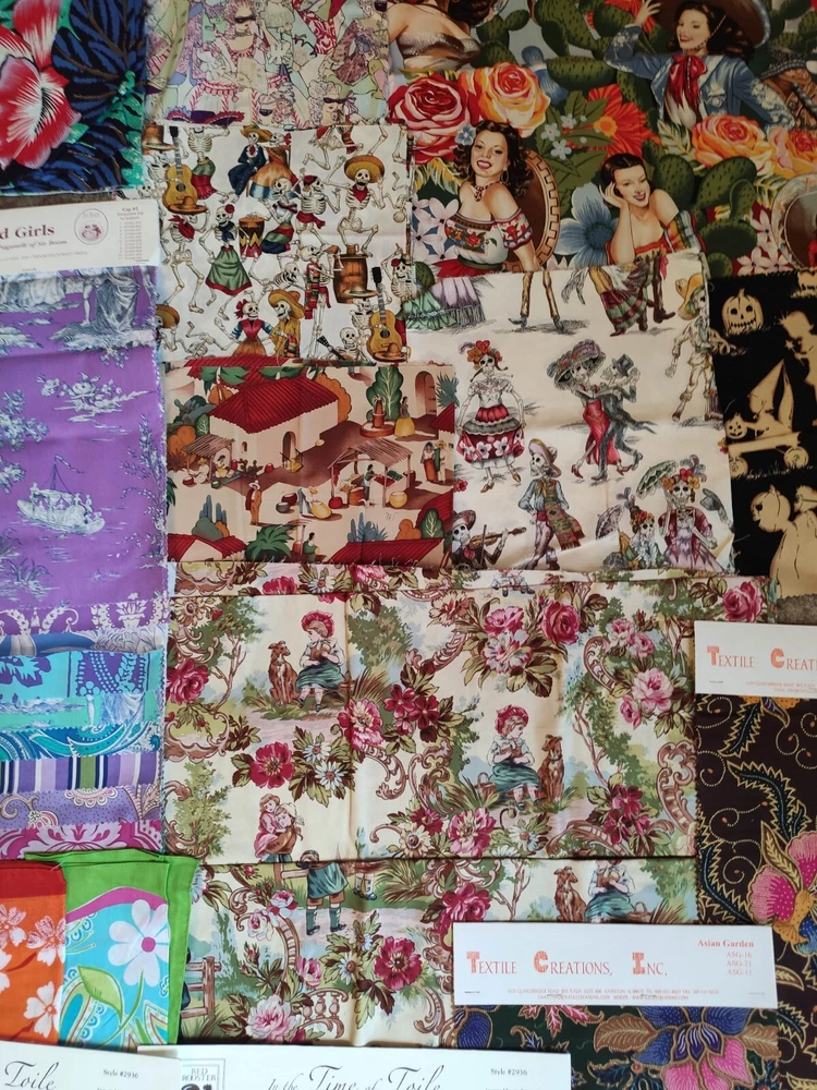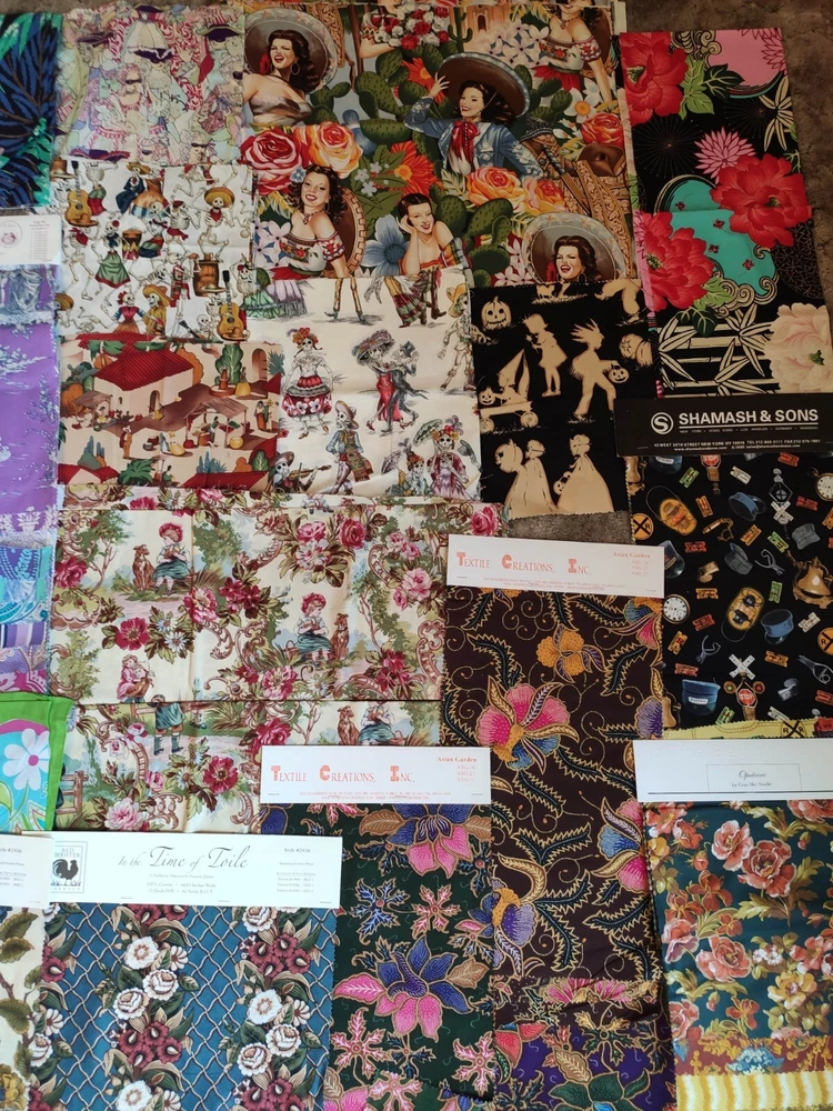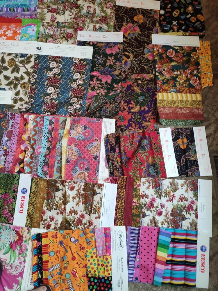 This lot of fabric includes a variety of brands, patterns, and colors, Alexander Henry, Griffin, Rooster, batik, toile, retro prints. The lot contains yardage suitable for quilting and crafting, and is perfect for those looking to expand their collection. Whether you're a seasoned quilter or just starting out, this lot is sure to inspire creativity. Some full yards, with average size being about quarter yard, and some a bit smaller.